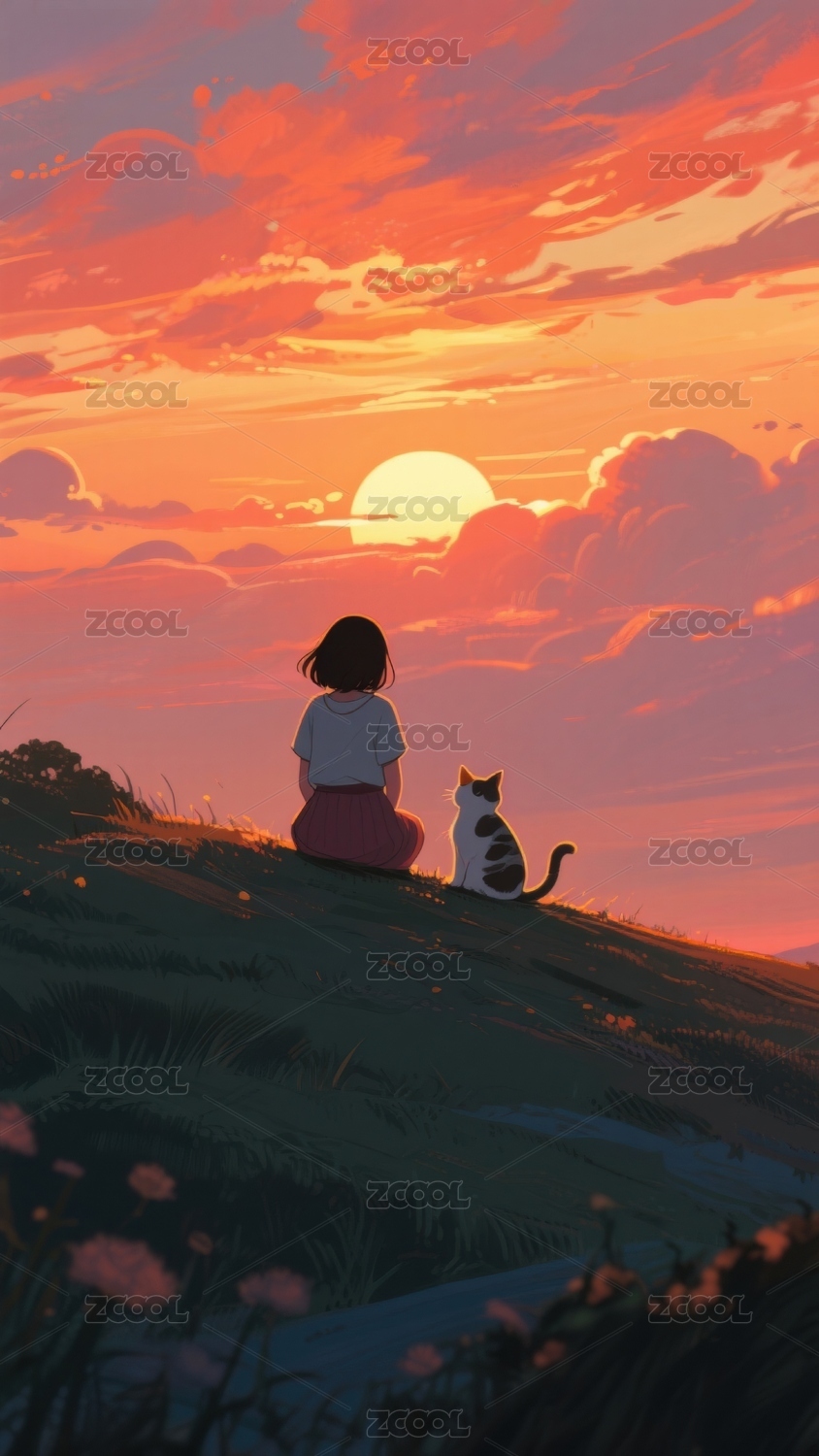 女孩与猫共赏日落