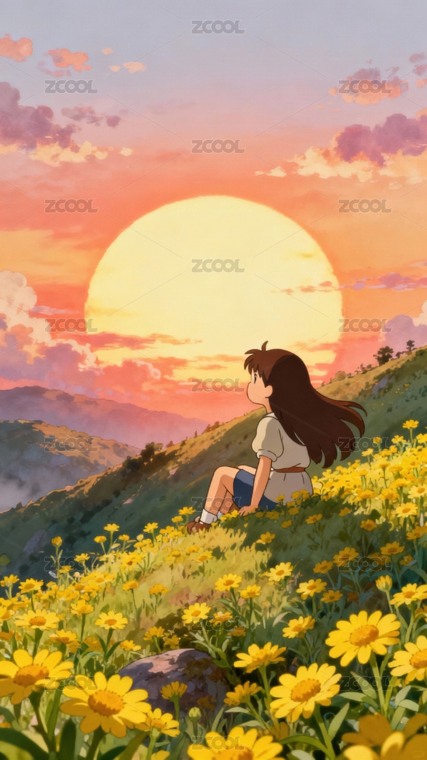 女孩坐在花坡上望夕阳