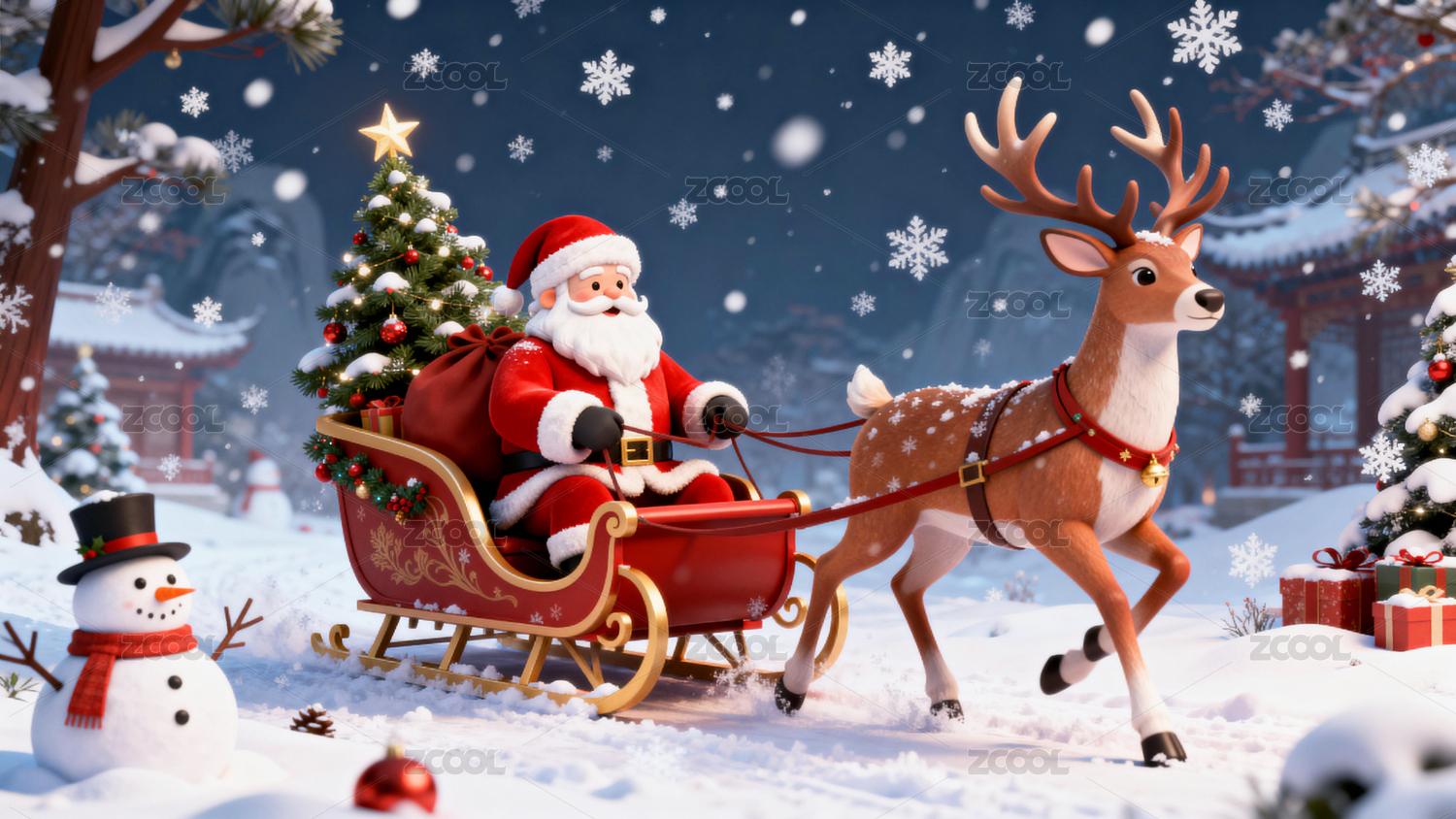 圣诞老人驾着驯鹿雪橇在雪夜飞驰