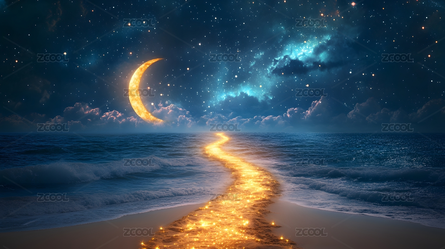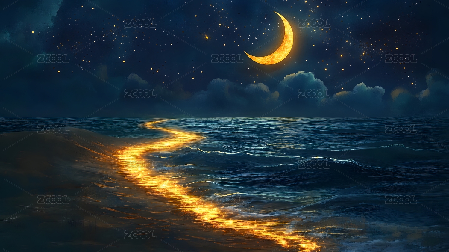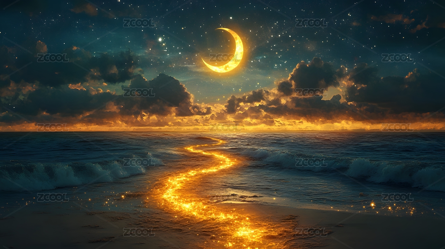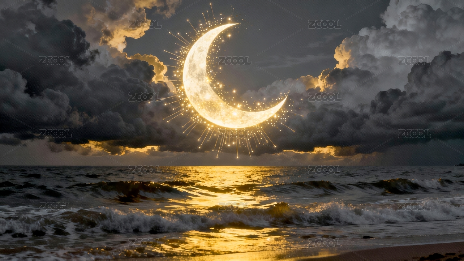 主视觉,商业,壁纸,月牙,金色,炫光,海洋,夜景,云层,海浪