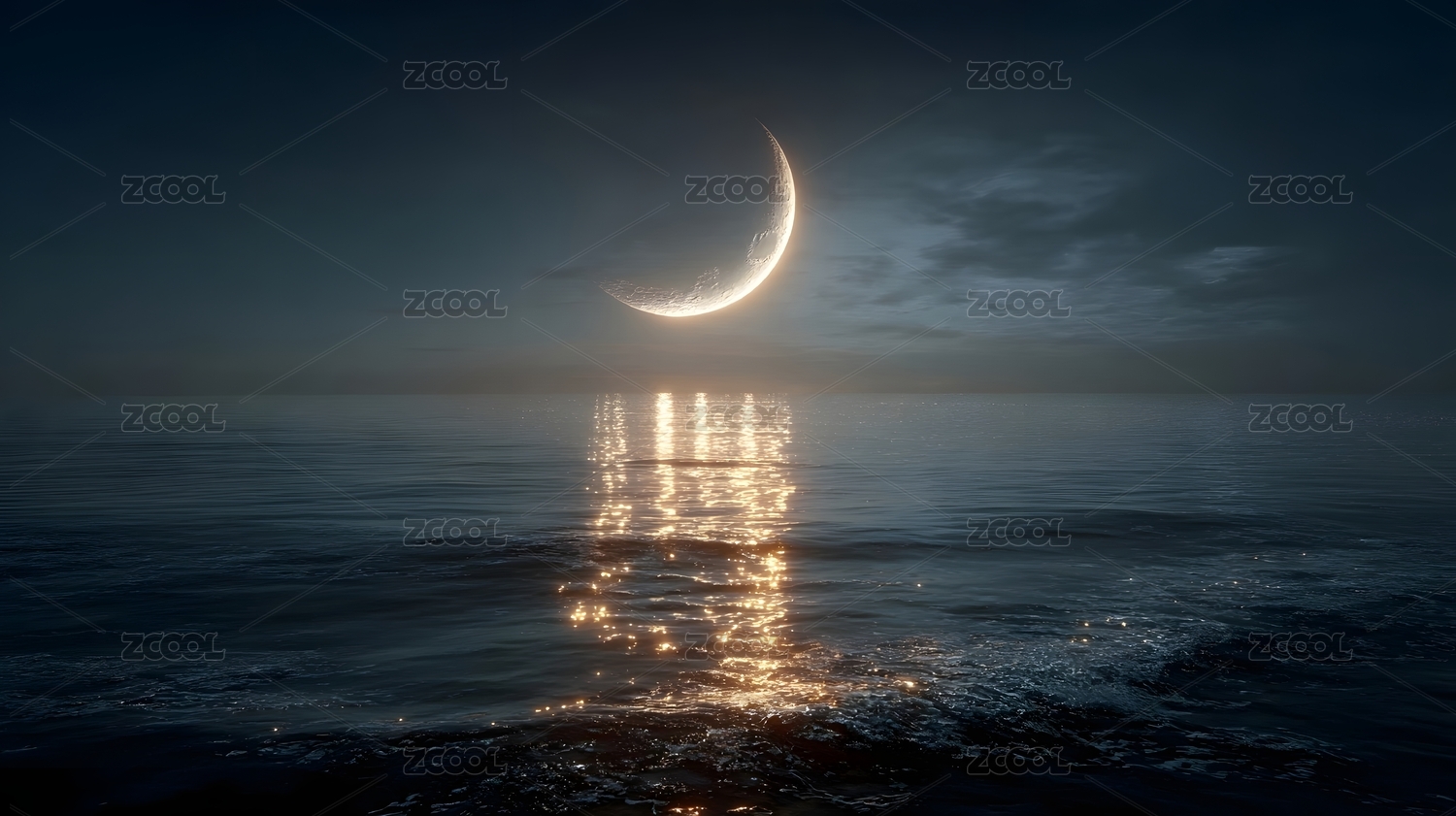 夜空下的宁静海面与新月