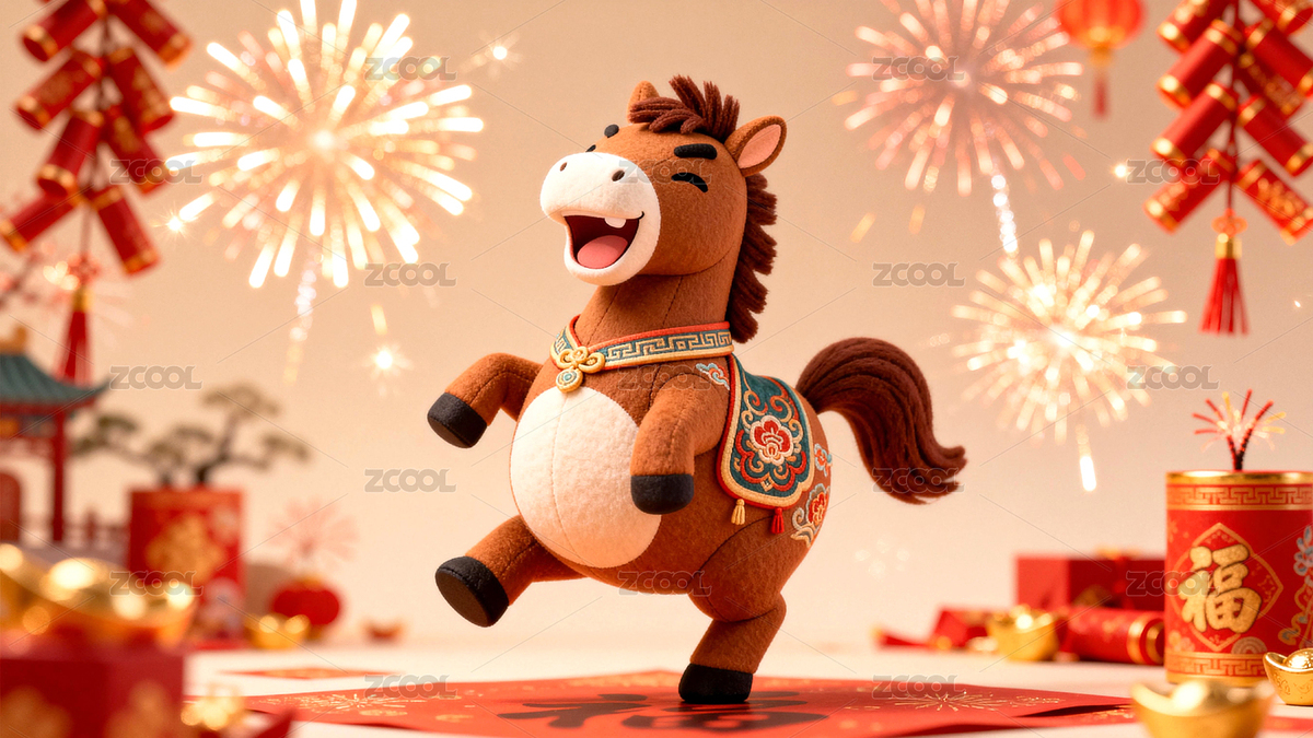 节日喜庆场景中的舞狮与小马马年喜庆的场景