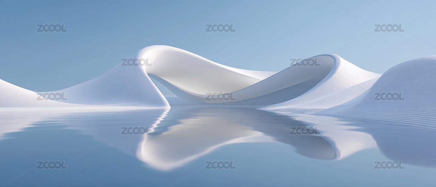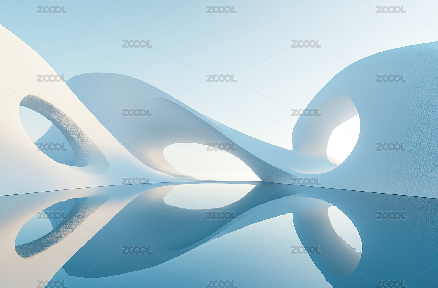 无人广场白色弯曲弧形建筑与倒影有天空背景