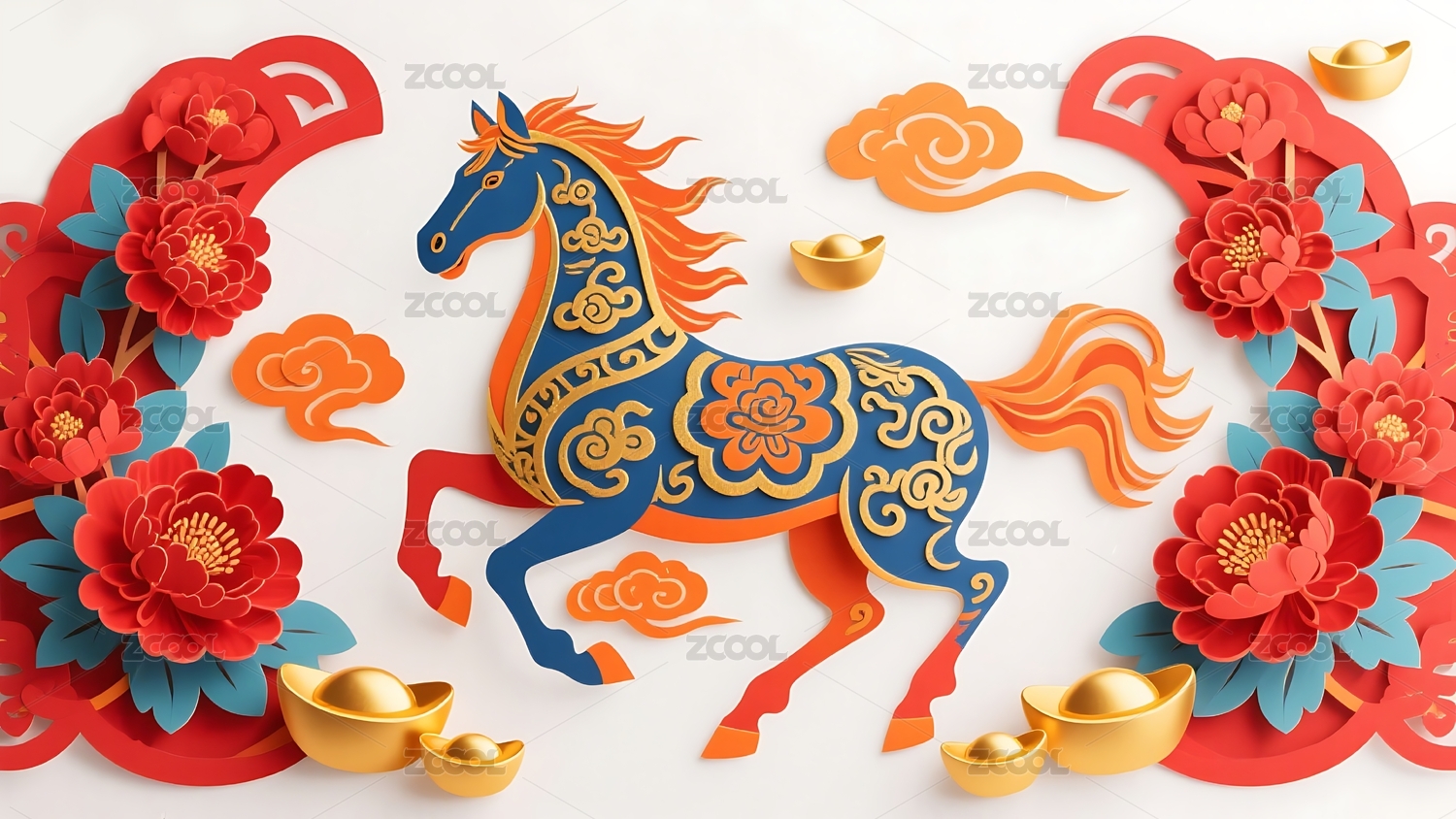 金色骏马剪纸配祥云红底图案