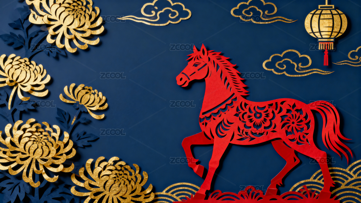 红色剪纸马配金色菊花与云纹装饰
