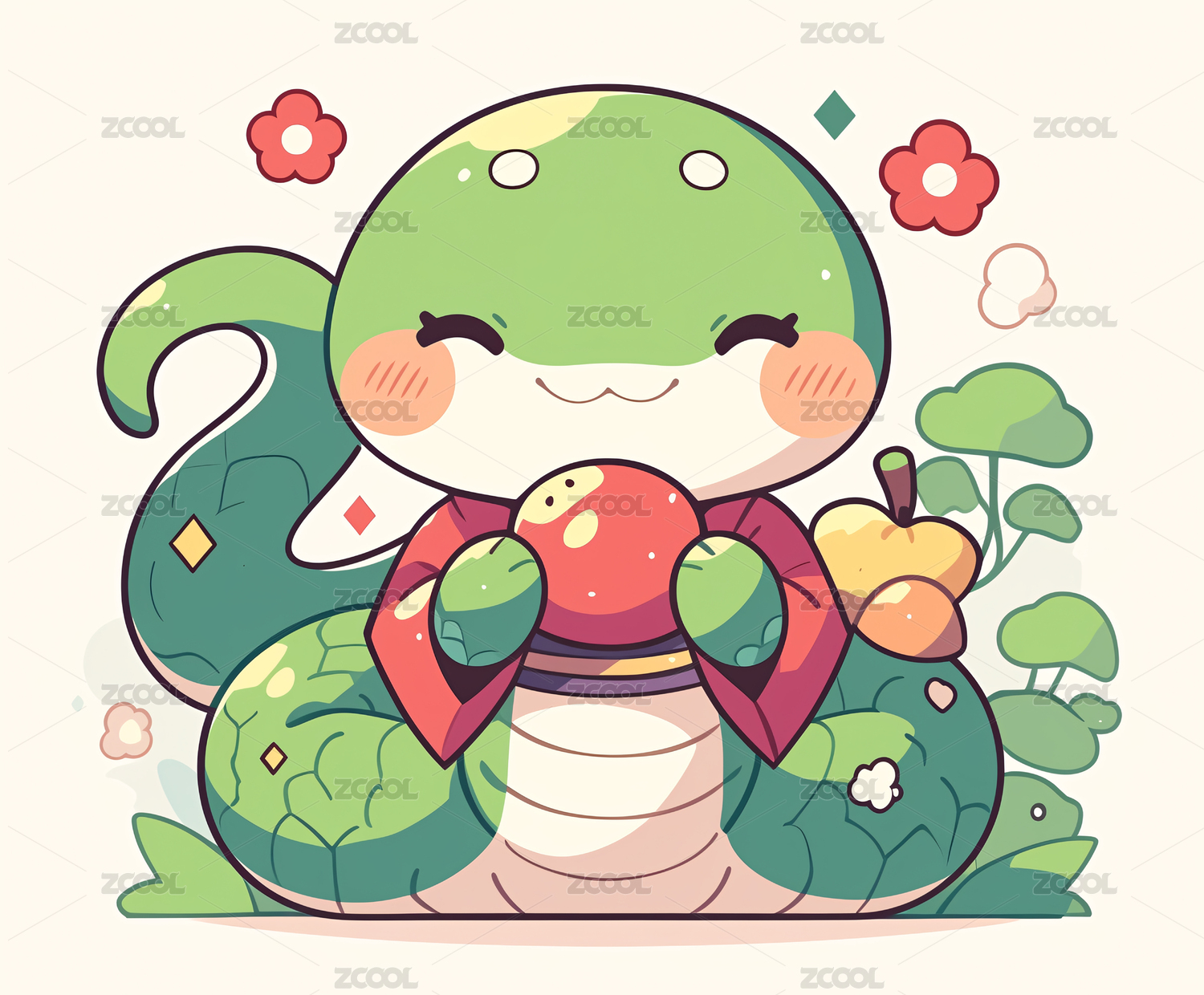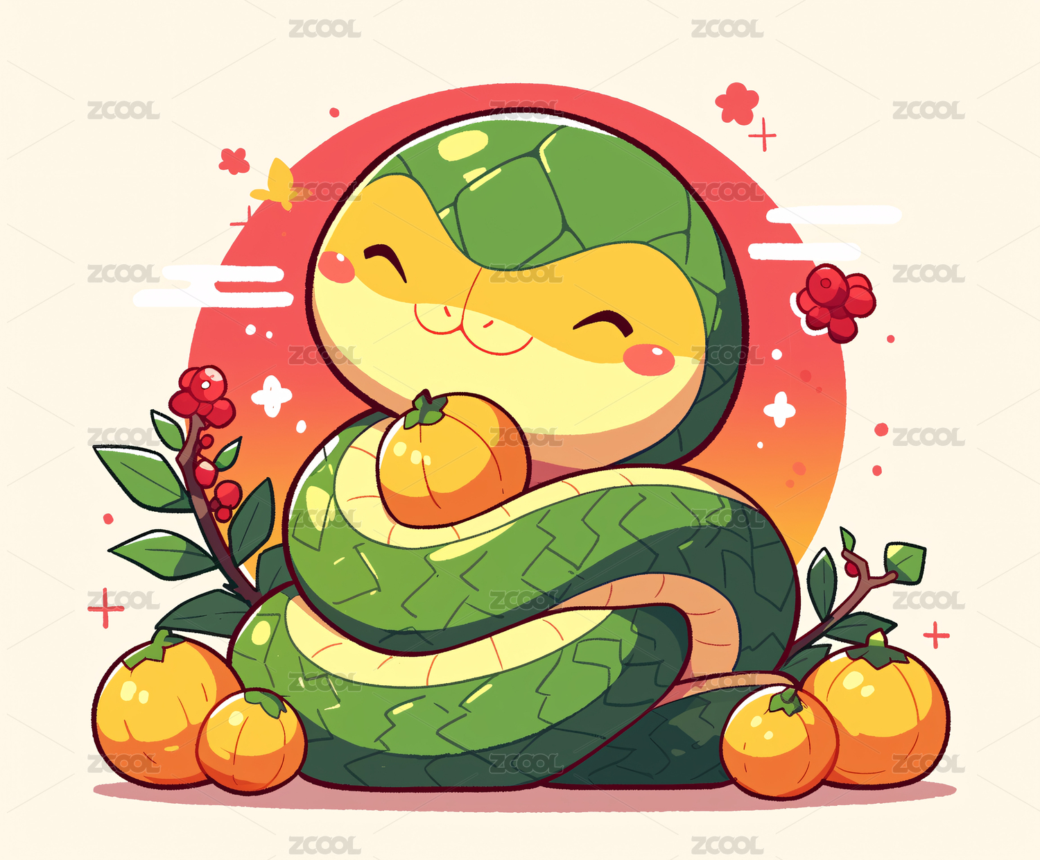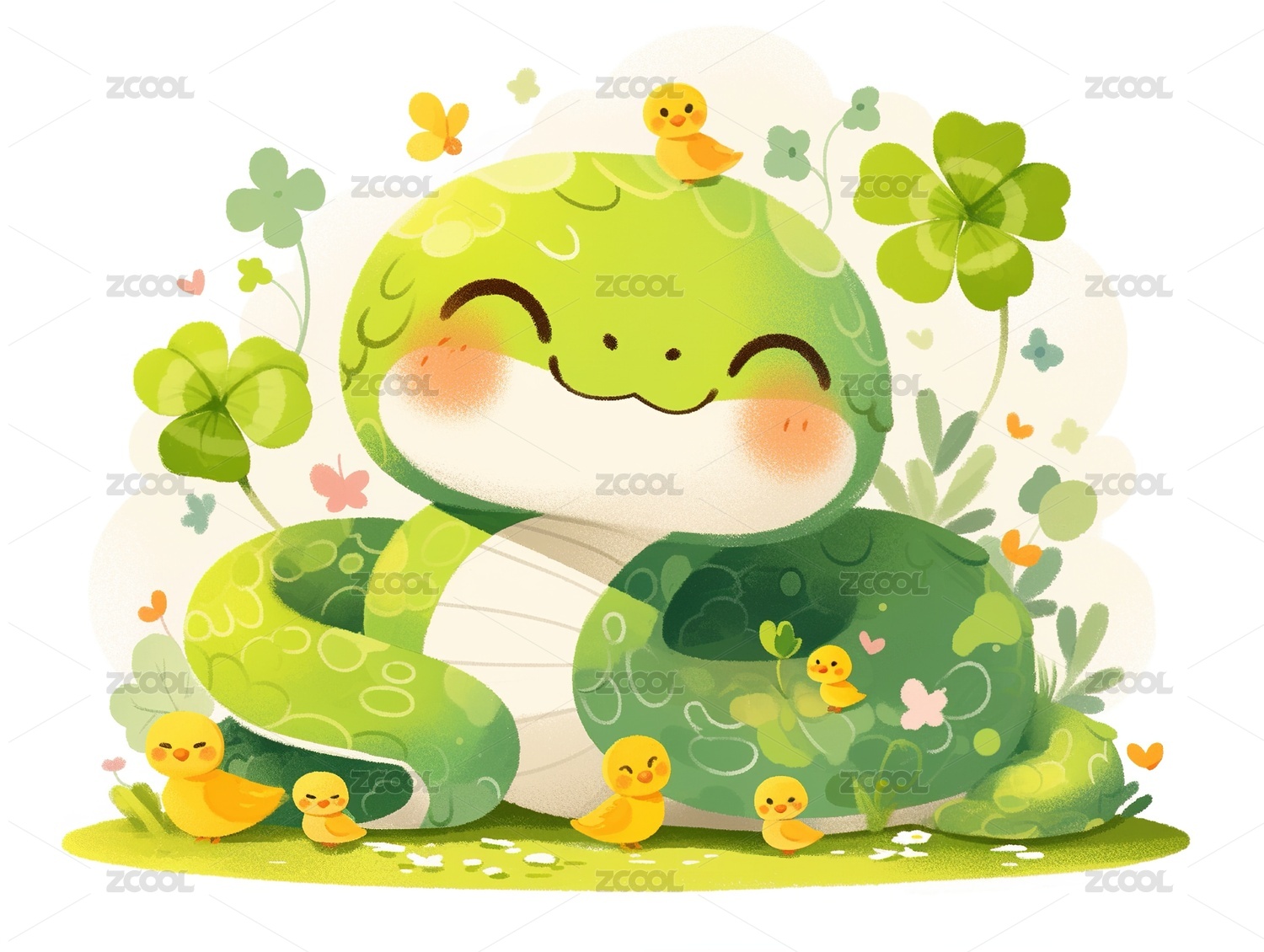 蛇年五行蛇插图,此张为五行木《灵蛇献瑞》