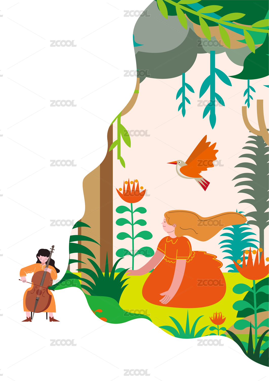 扁平人物动物新年植物女孩侧面小鸟森林绿色