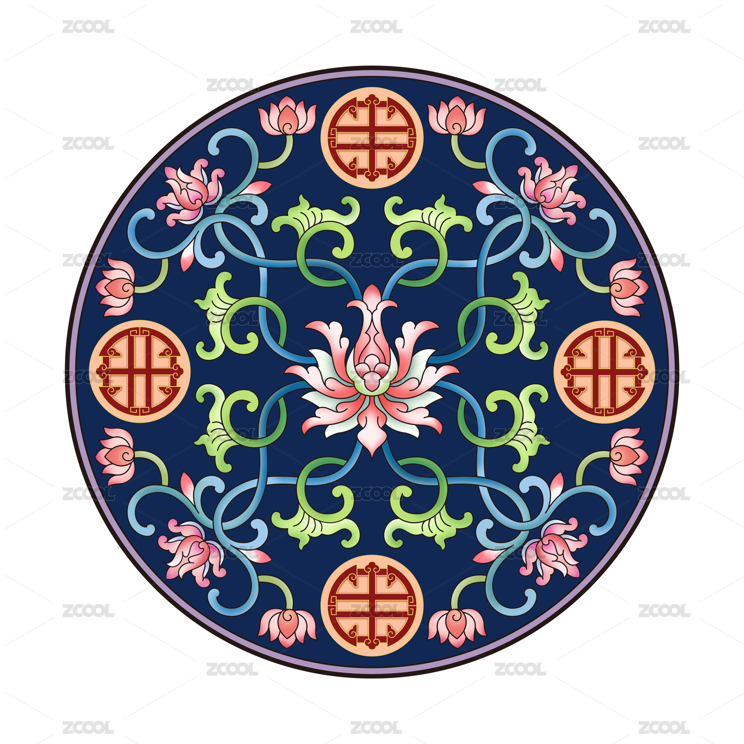 中国传统的彩色缠枝花纹圆形图案,白色背景