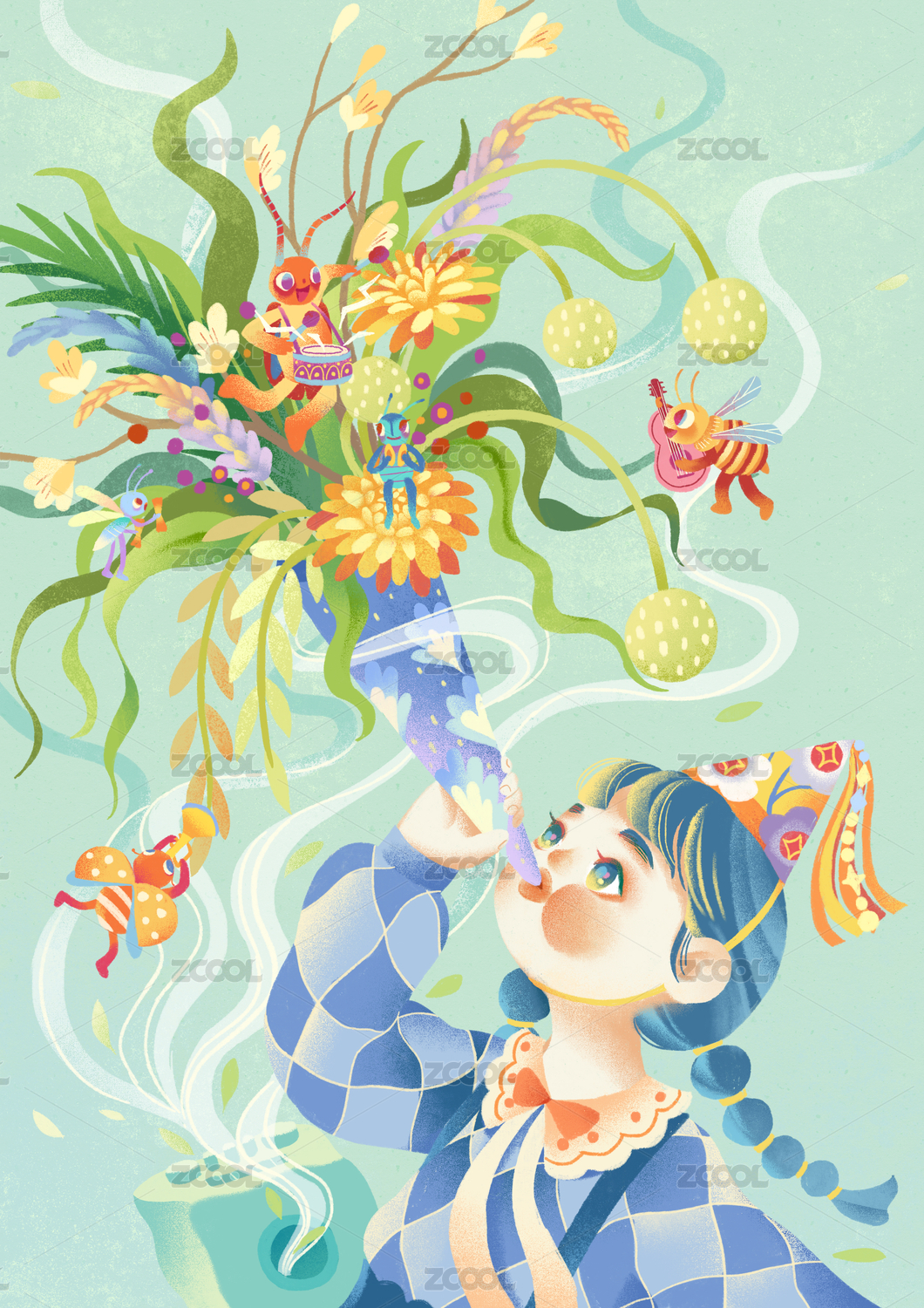 音乐会飞翔草帽女孩演奏小提琴兔子跳舞插画