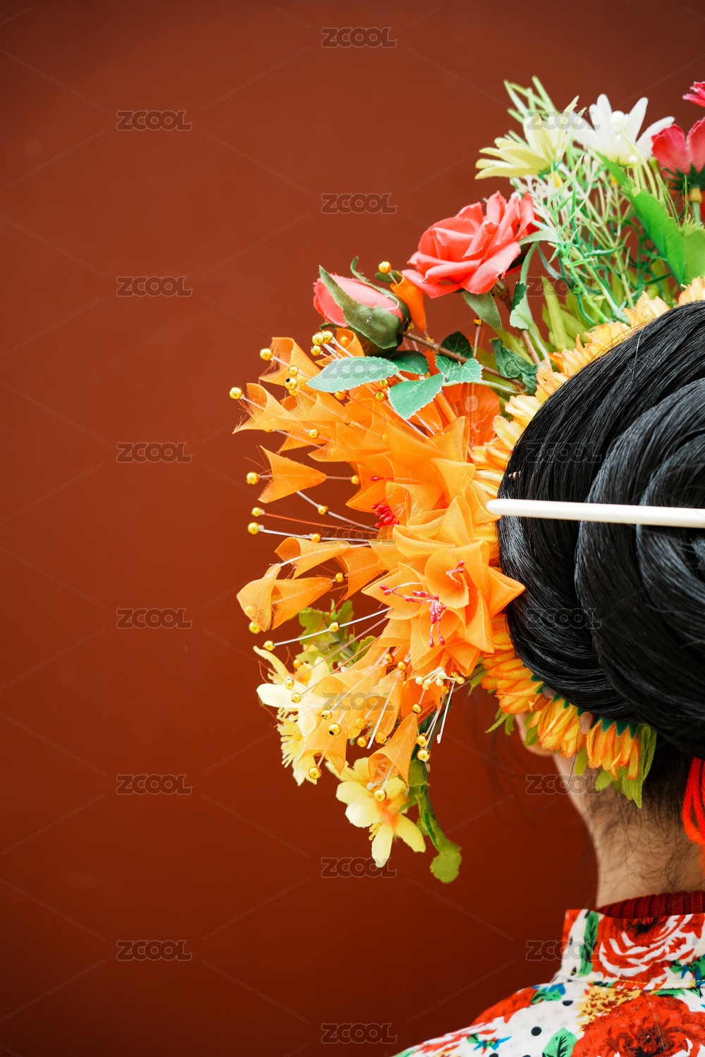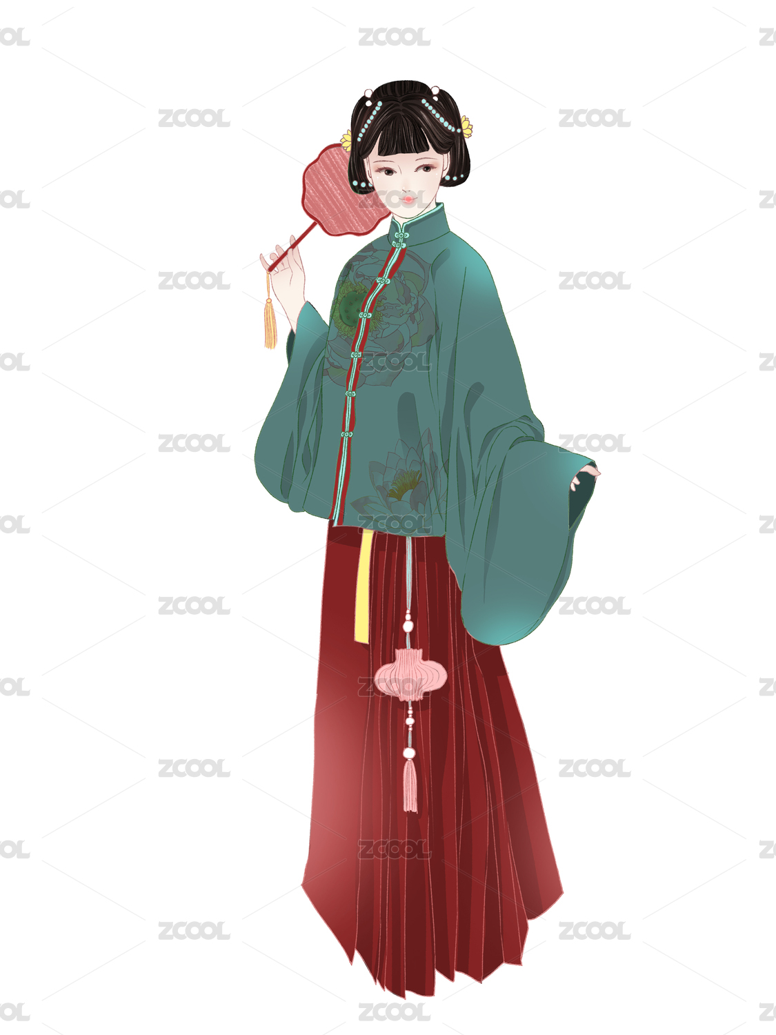 身着唐代宫廷簪花仕女服手持轻扇的女性