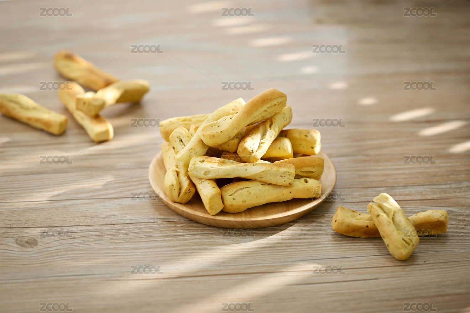 放在木纹背景上盘子里的香酥棒棒馍