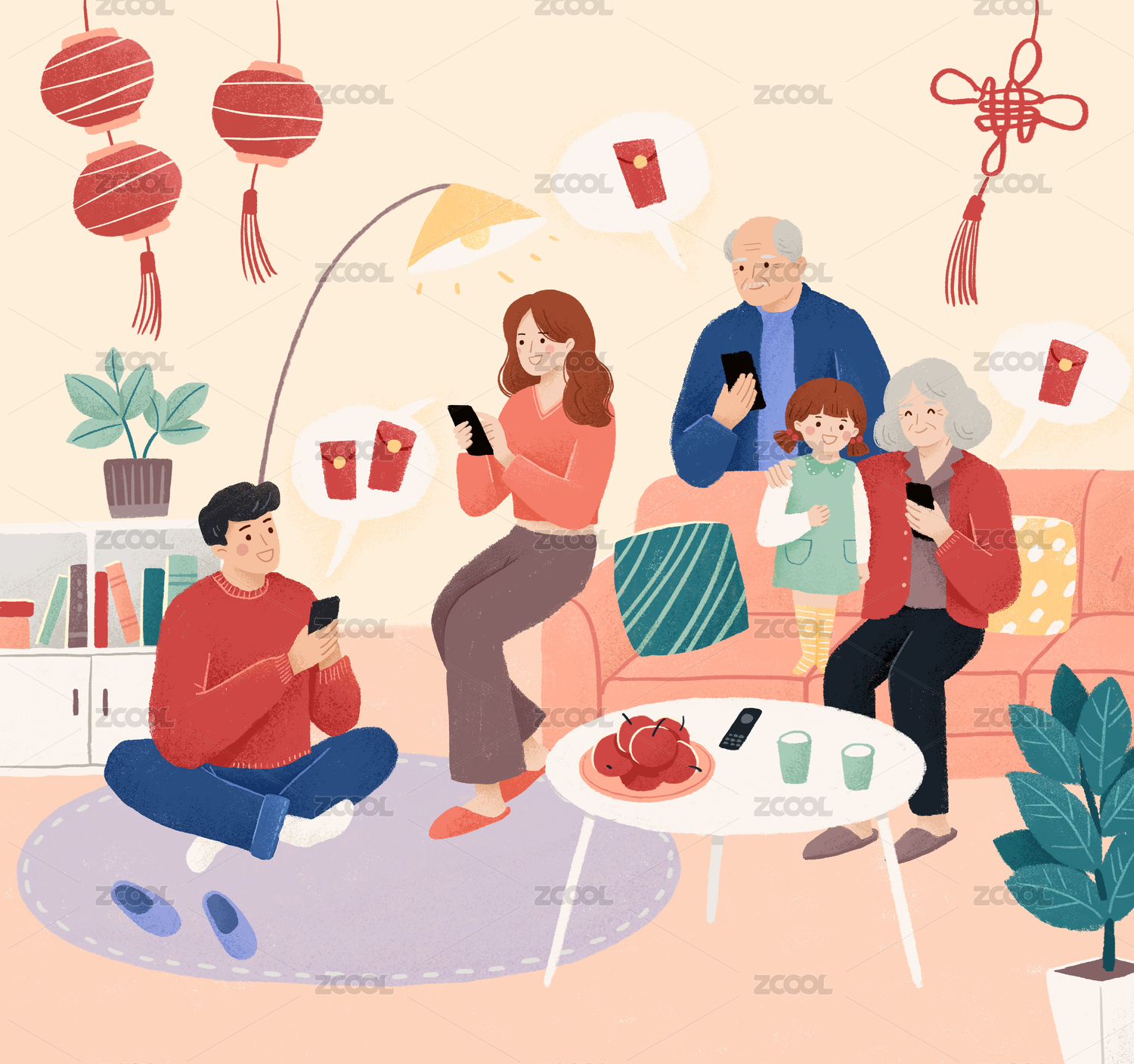 春节一家人过年抢红包插画