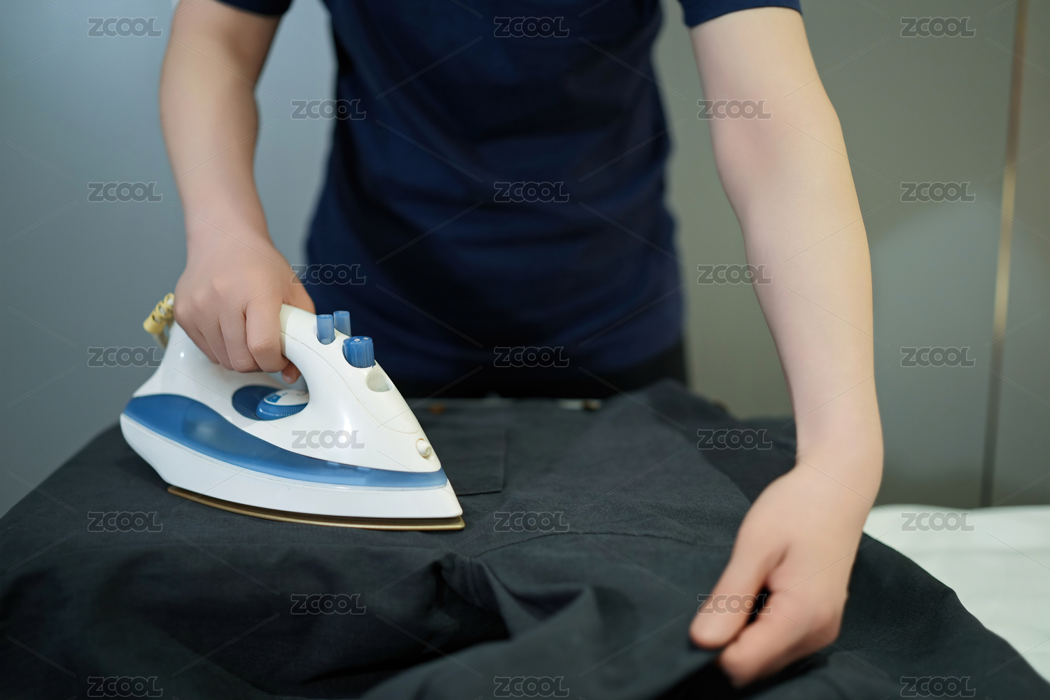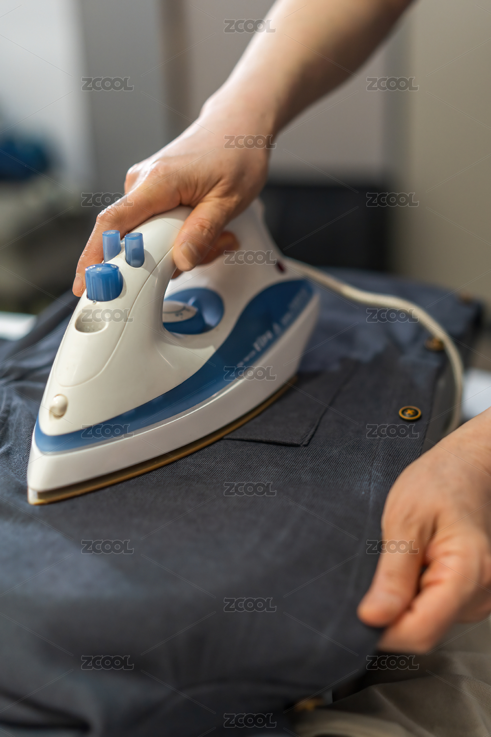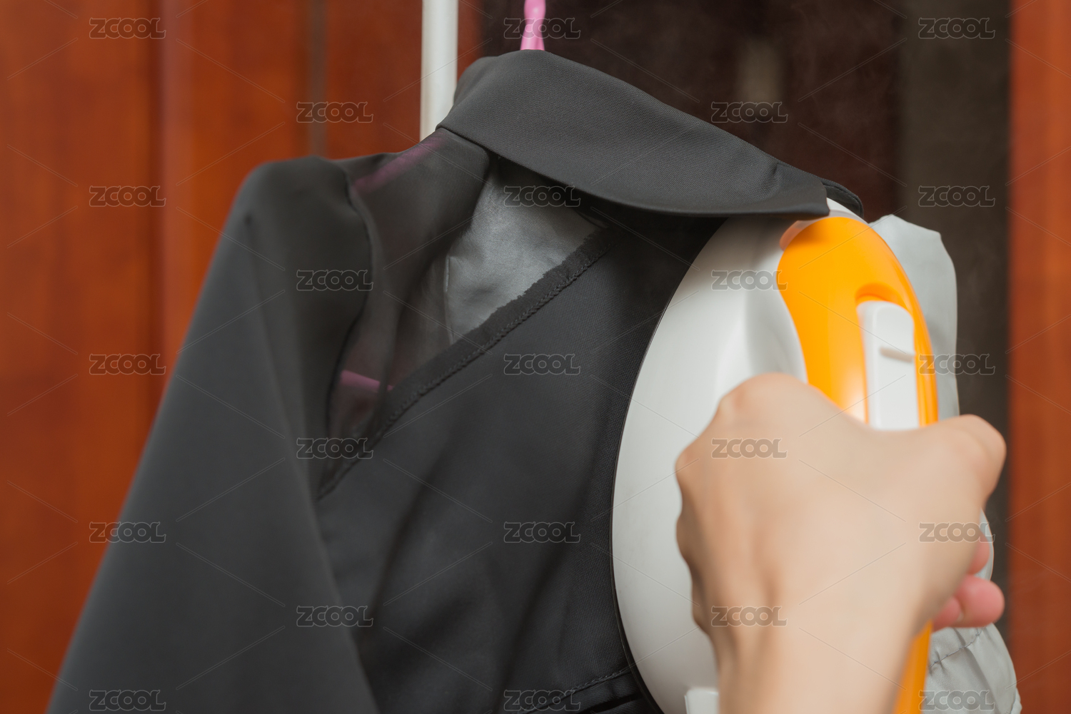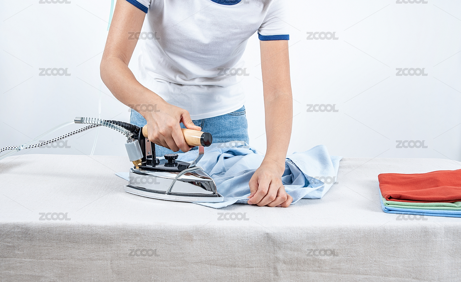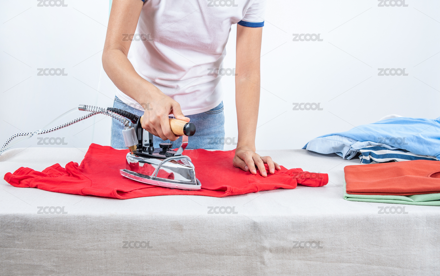 一个亚洲家庭妇女手拿熨烫好的衣服