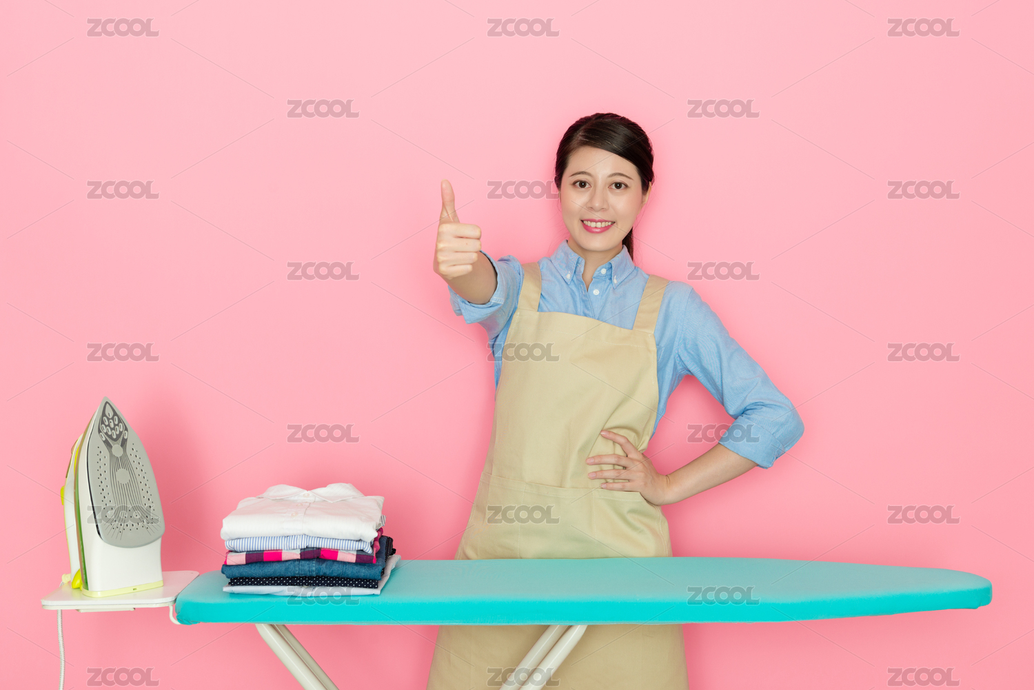美丽快乐的家庭主妇完成熨烫所有家庭服装面镜头微笑和显示大拇指向上的姿态孤立的粉红色背景。