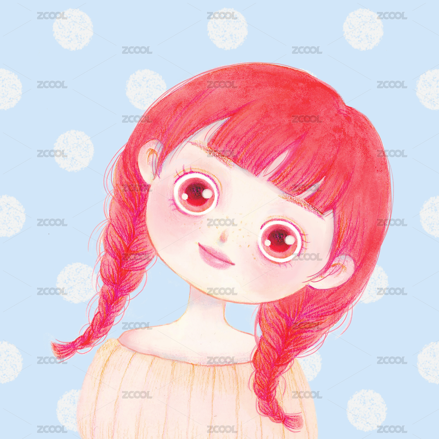 温暖手绘-歪头红发大眼睛女孩