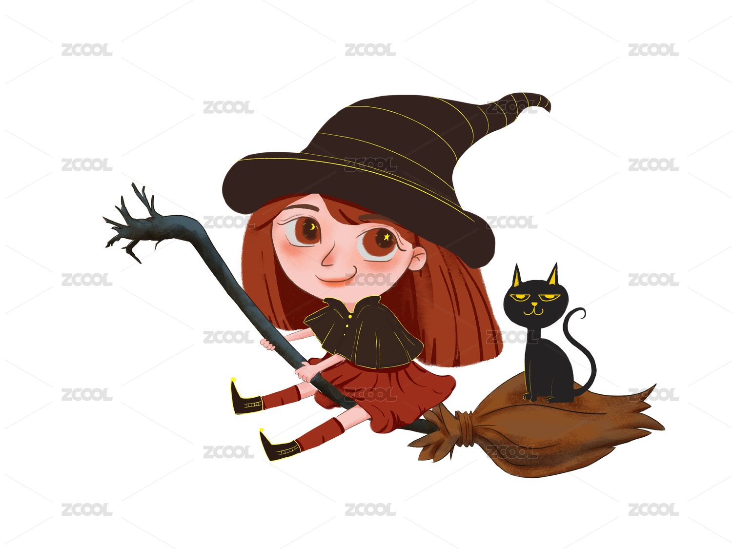 橙色卡通风红发女巫猫咪南瓜灯蝙蝠万圣节