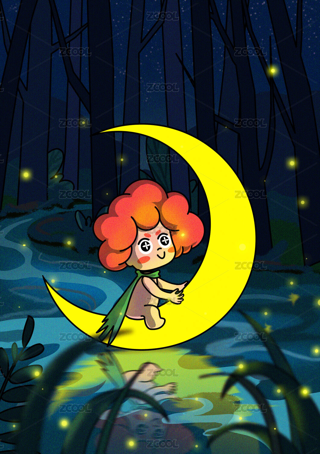 有萤火的夜晚乘着月亮漂流在小河的红发小孩
