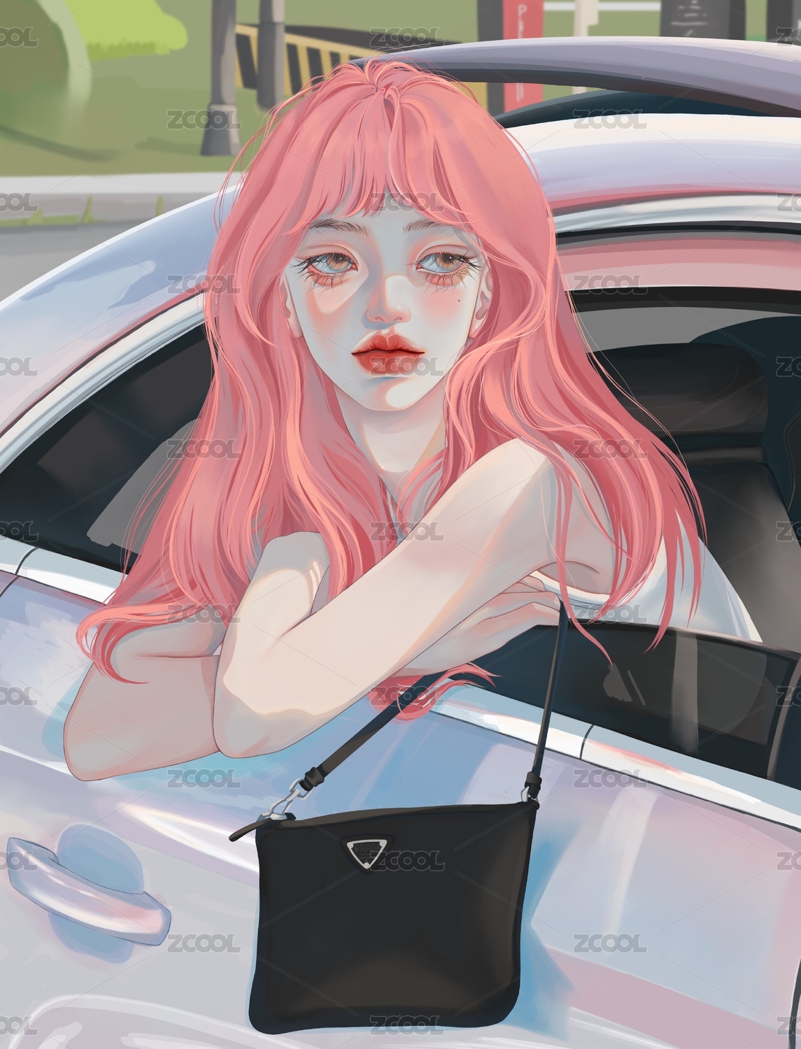 坐在车内很悠闲的红发女神