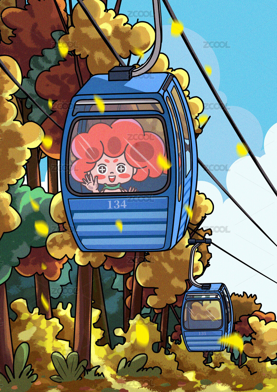 乘坐蓝色缆车透过窗户观赏秋色的红发小孩