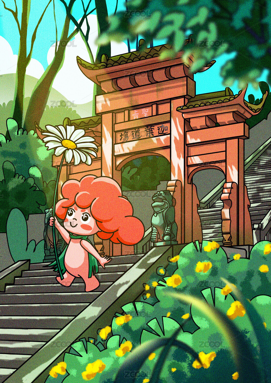 拿着白色雏菊的红发小孩走下台阶