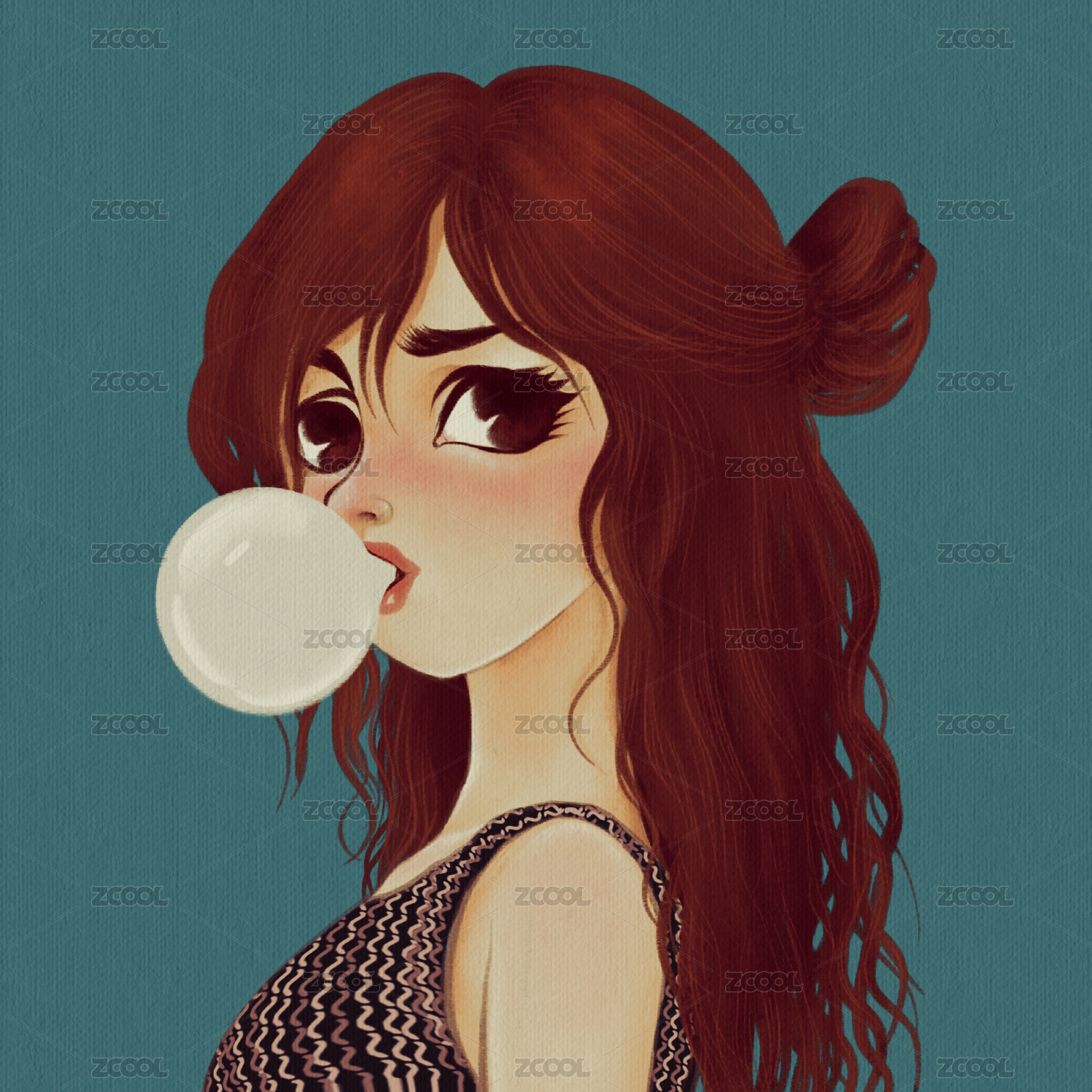 吹泡泡复古可爱的红发美女卡通插画