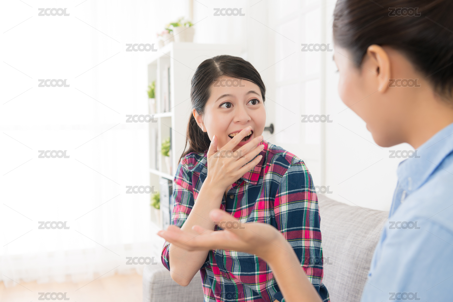 漂亮开朗的女孩走幽默笑话的故事,她在客厅里快乐享受闲暇时光的妹妹在一起。选择重点照片。