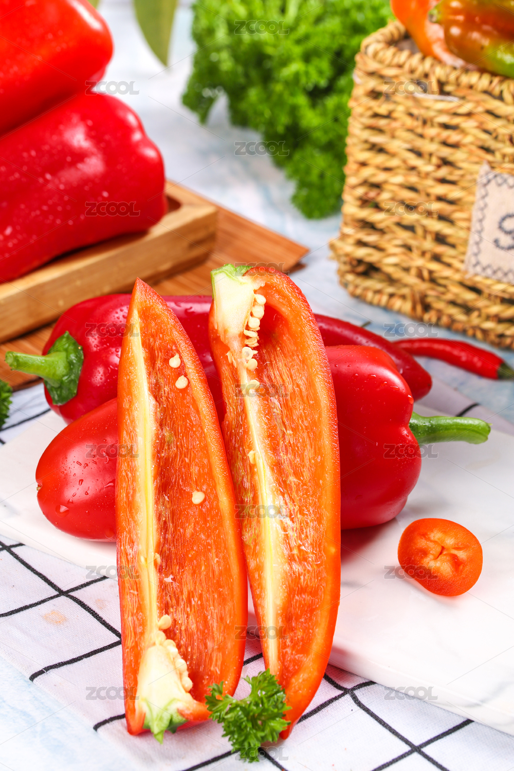 白底上放着红辣椒和切开的红椒
