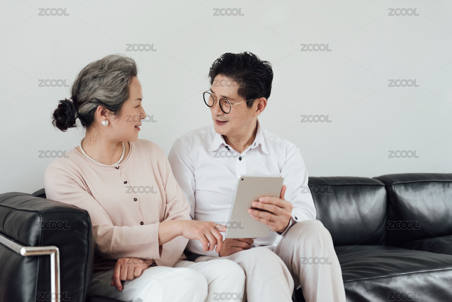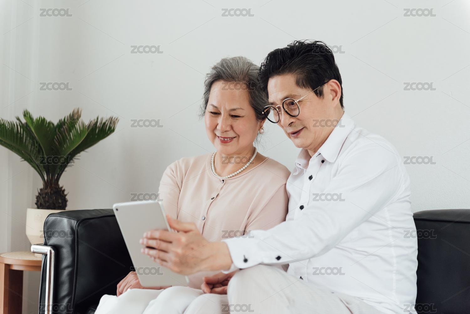 一对亚洲的老年夫妻在沙发上使用电子设备