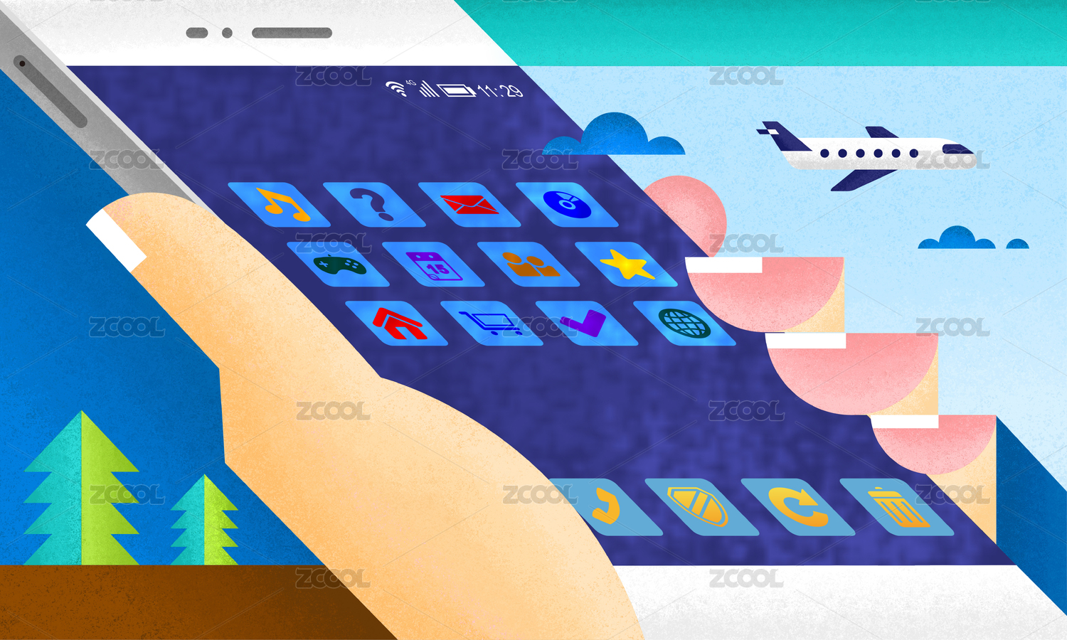 手里握着手机里面是各种APP 背景是天空和飞机