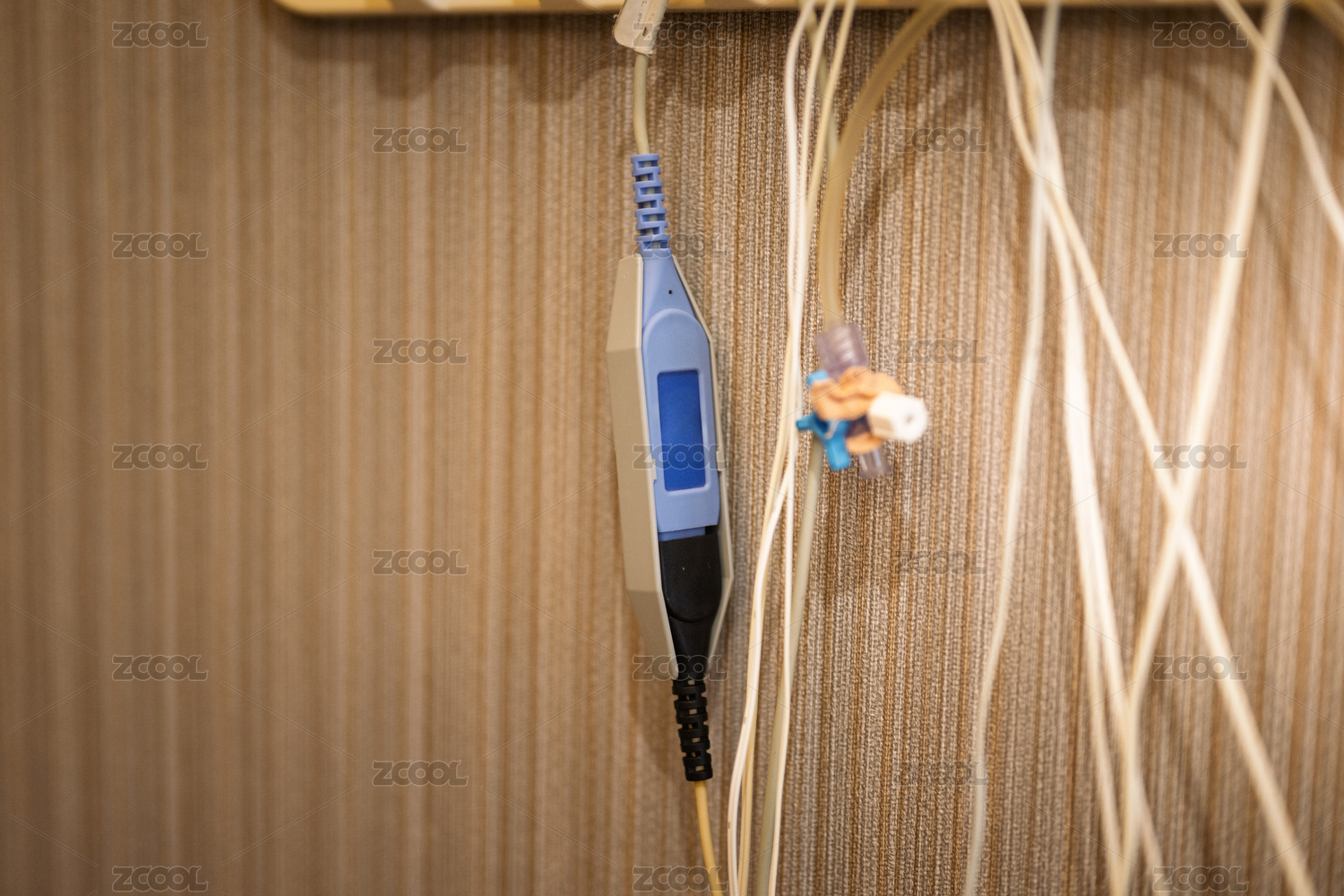 墙上的蓝色电子设备与电线