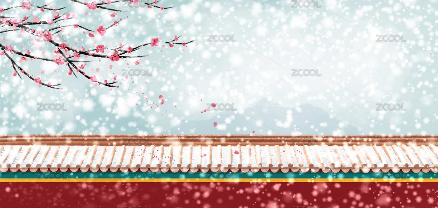 冬季大雪中唯美红墙梅花开落花古风水墨插画