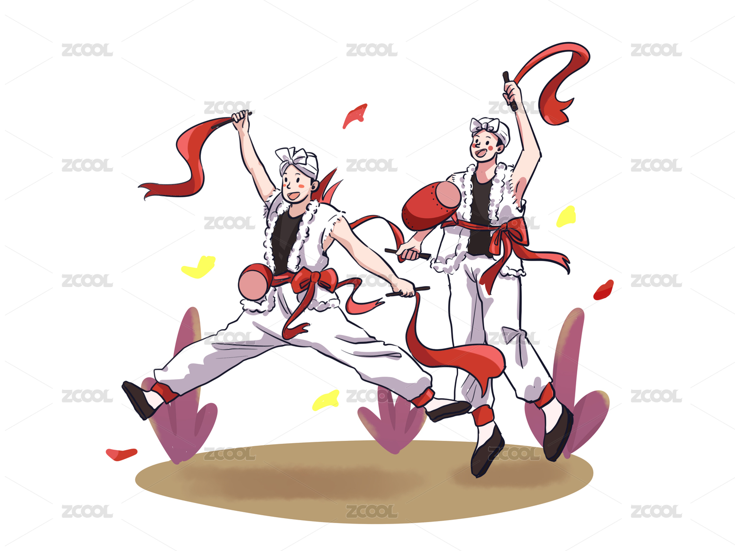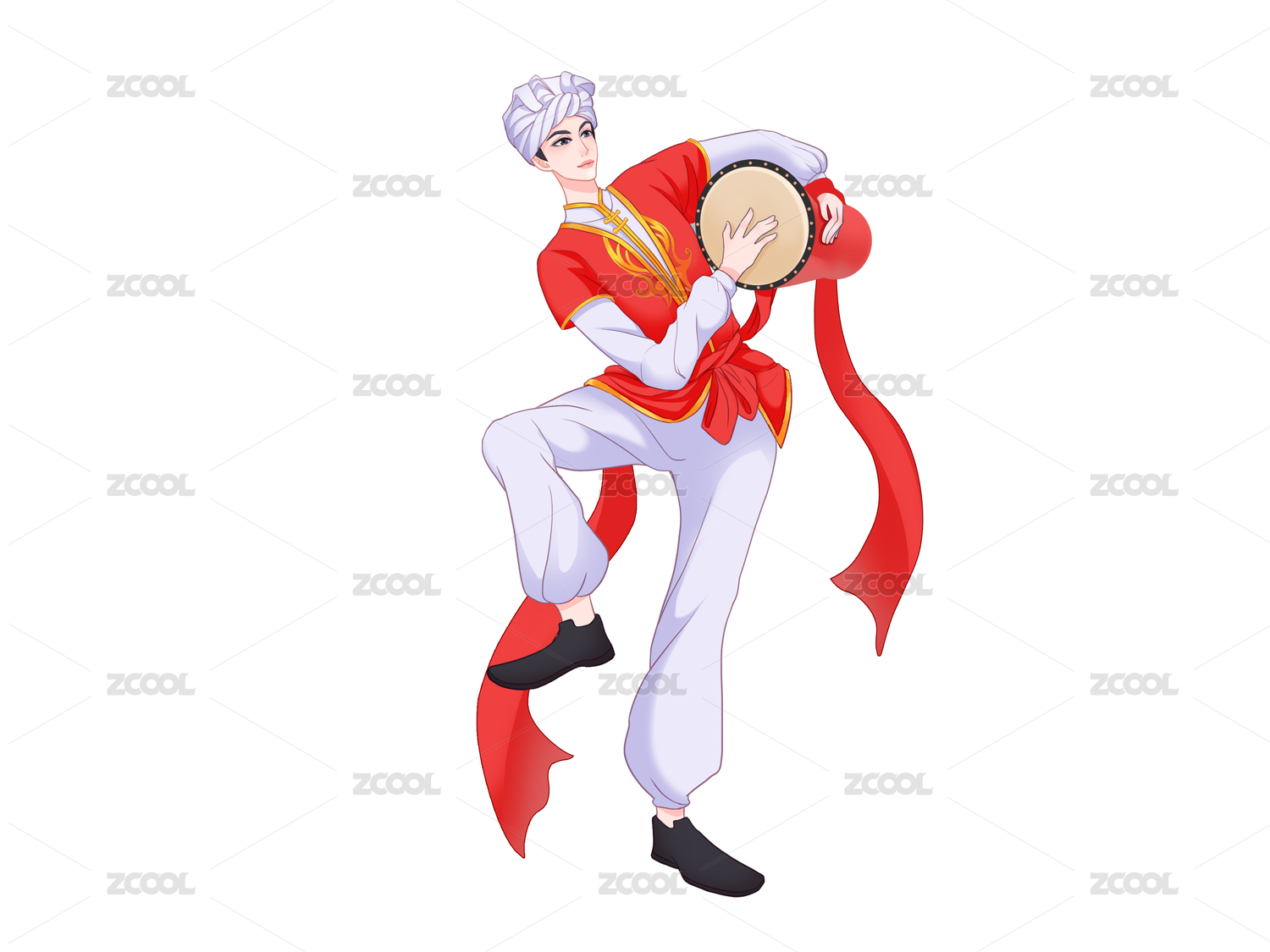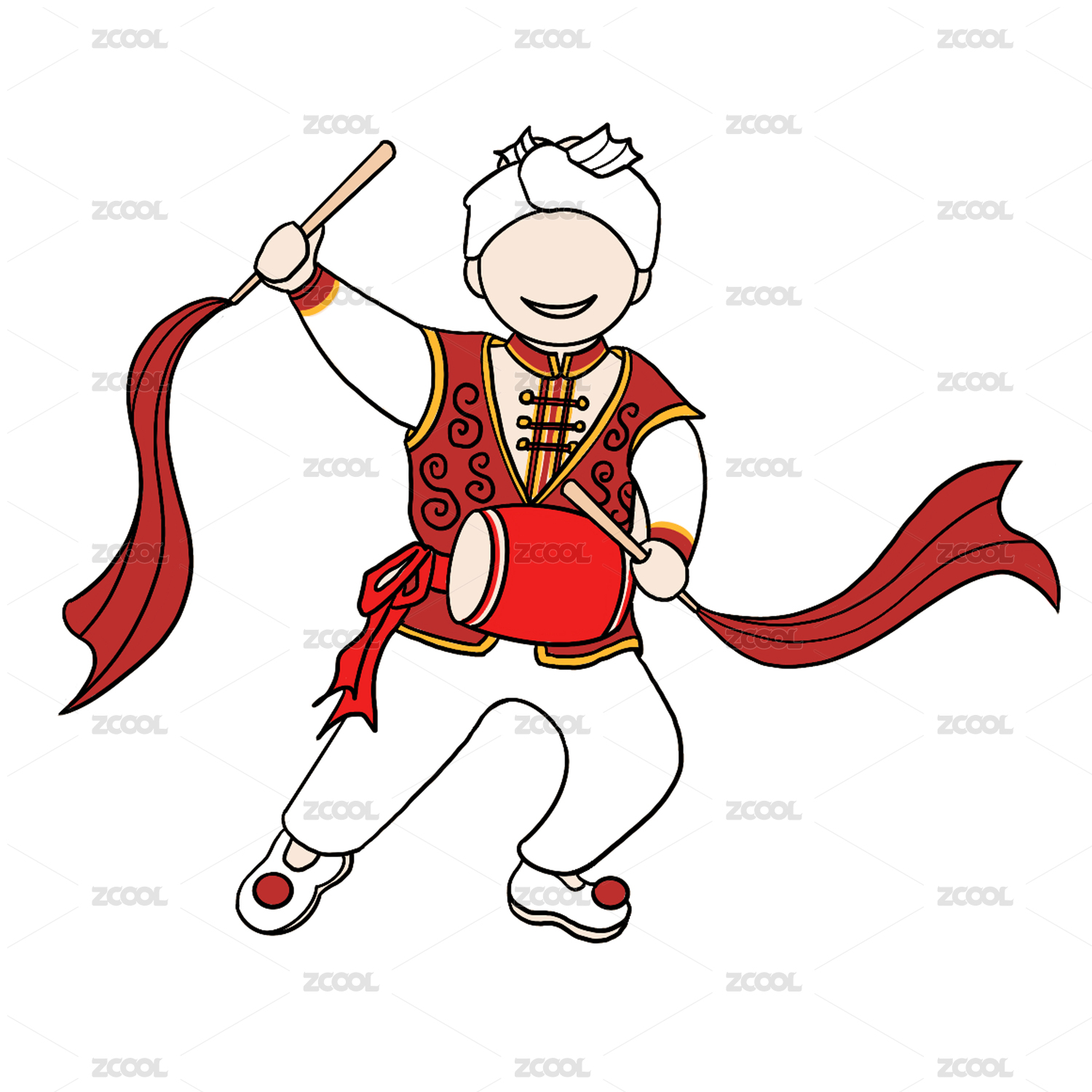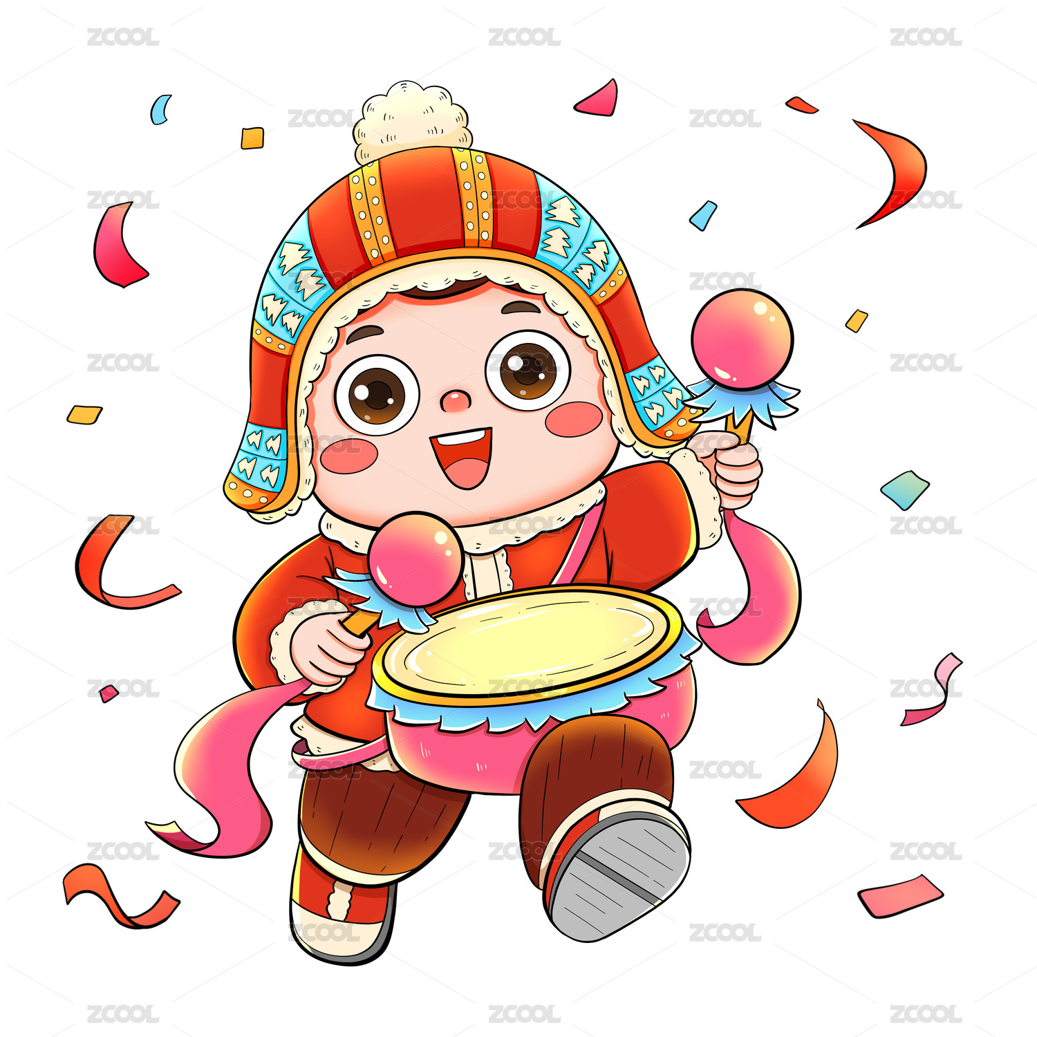 红色卡通喜庆男性彩带敲腰鼓元素
