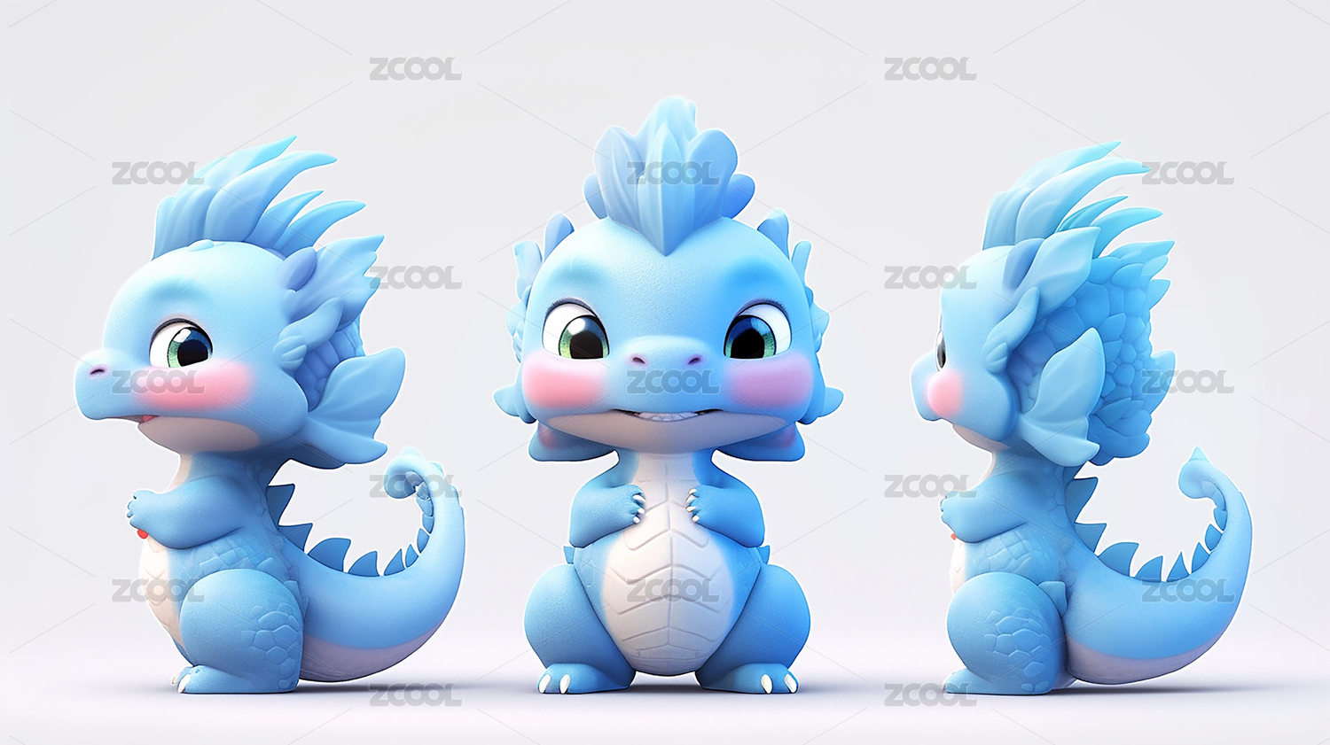可爱的蓝色小龙卡通形象设计IP设计三视图