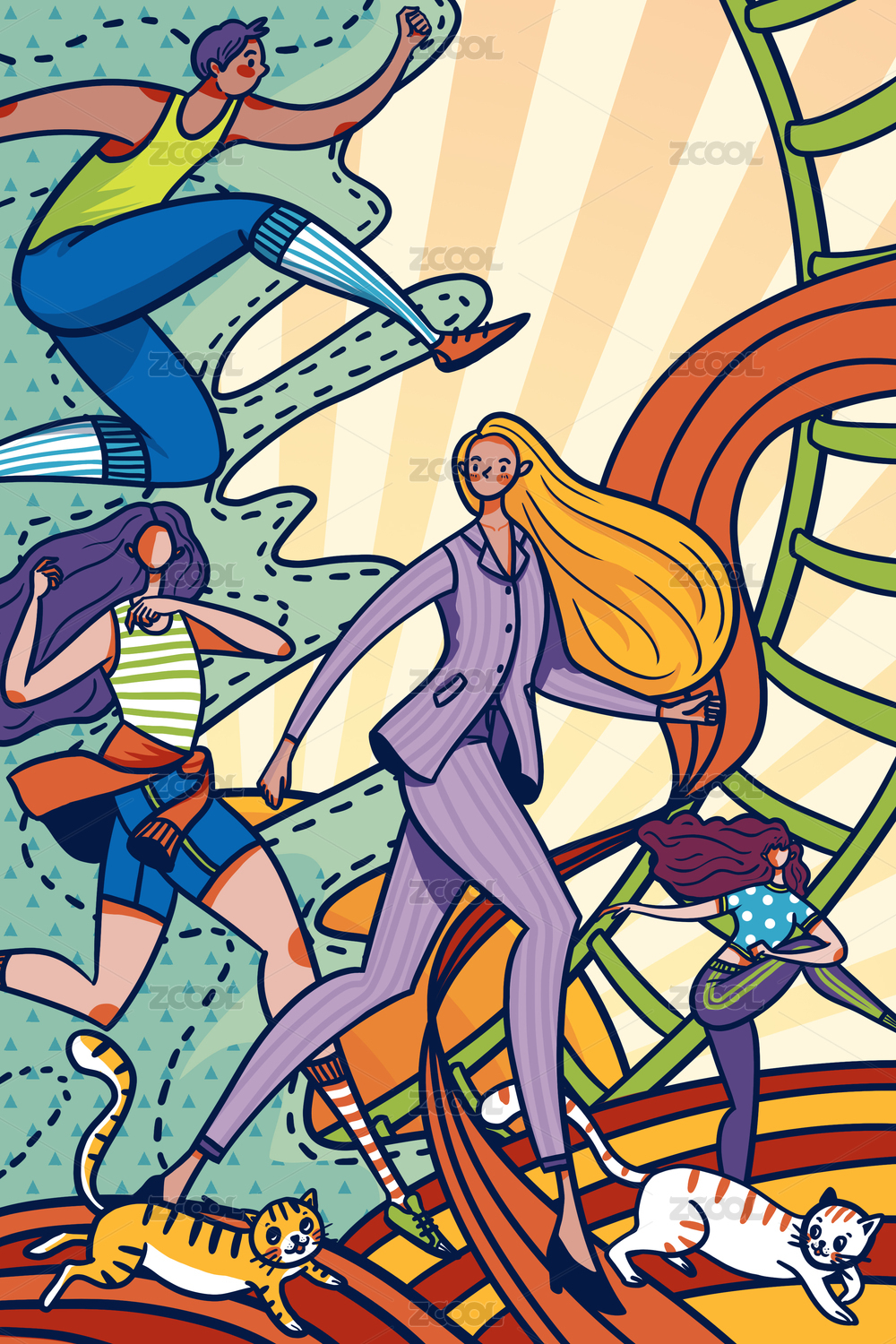 一群奔跑的人和两只奔跑的猫