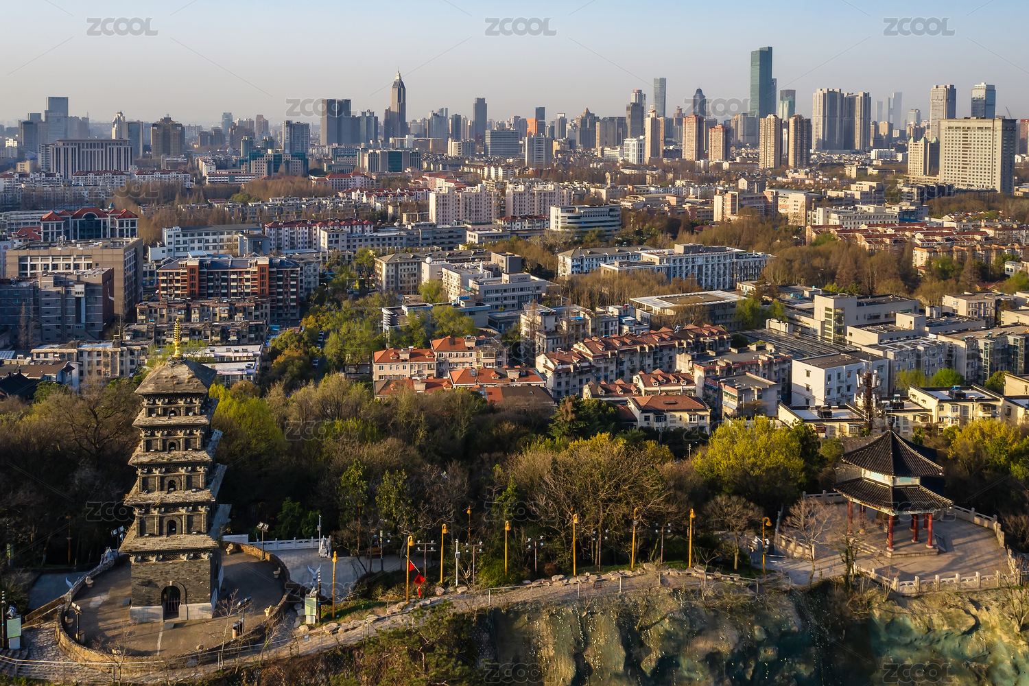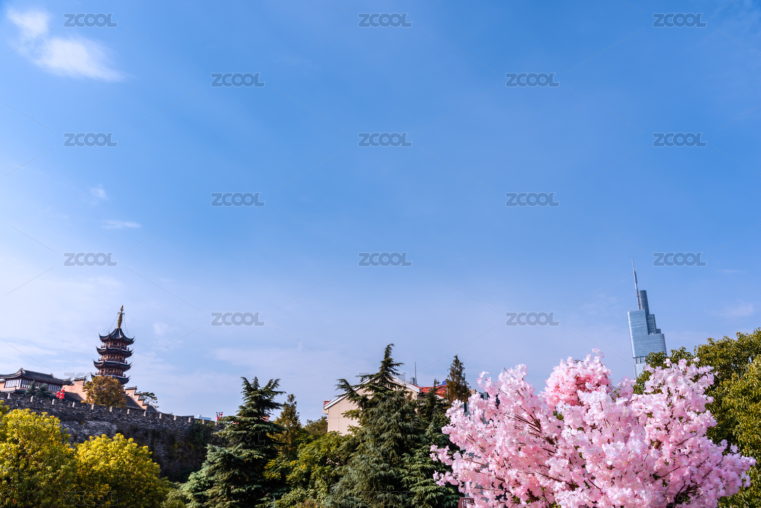 中国南京明城墙鸡鸣寺和CBD大厦