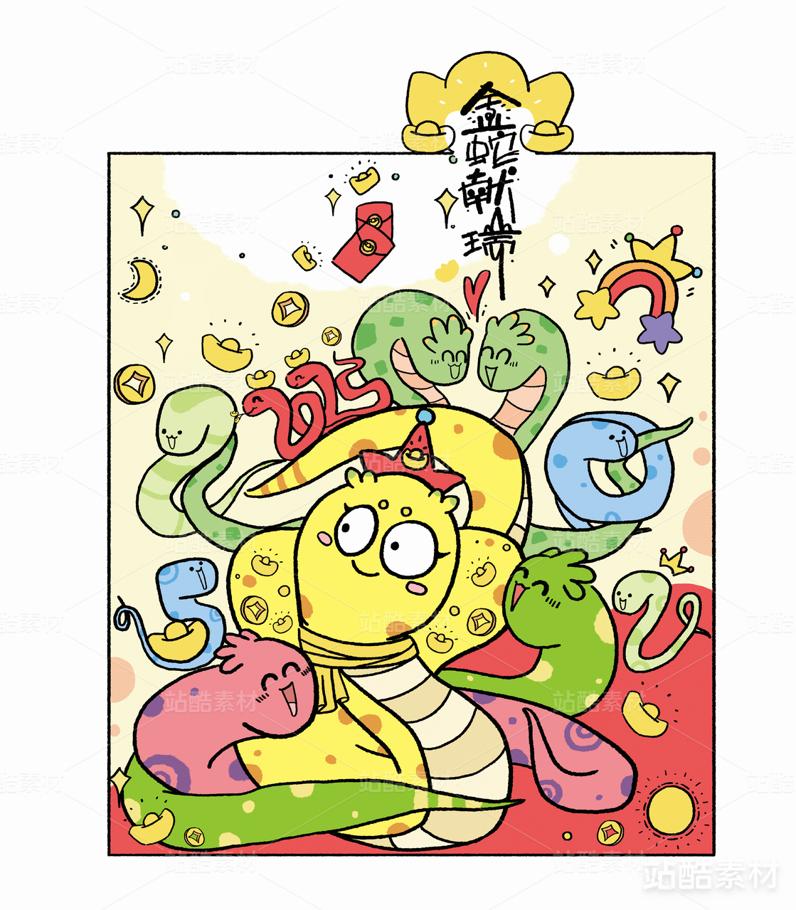 蛇年IP卡通贴纸红包插画 金蛇献瑞