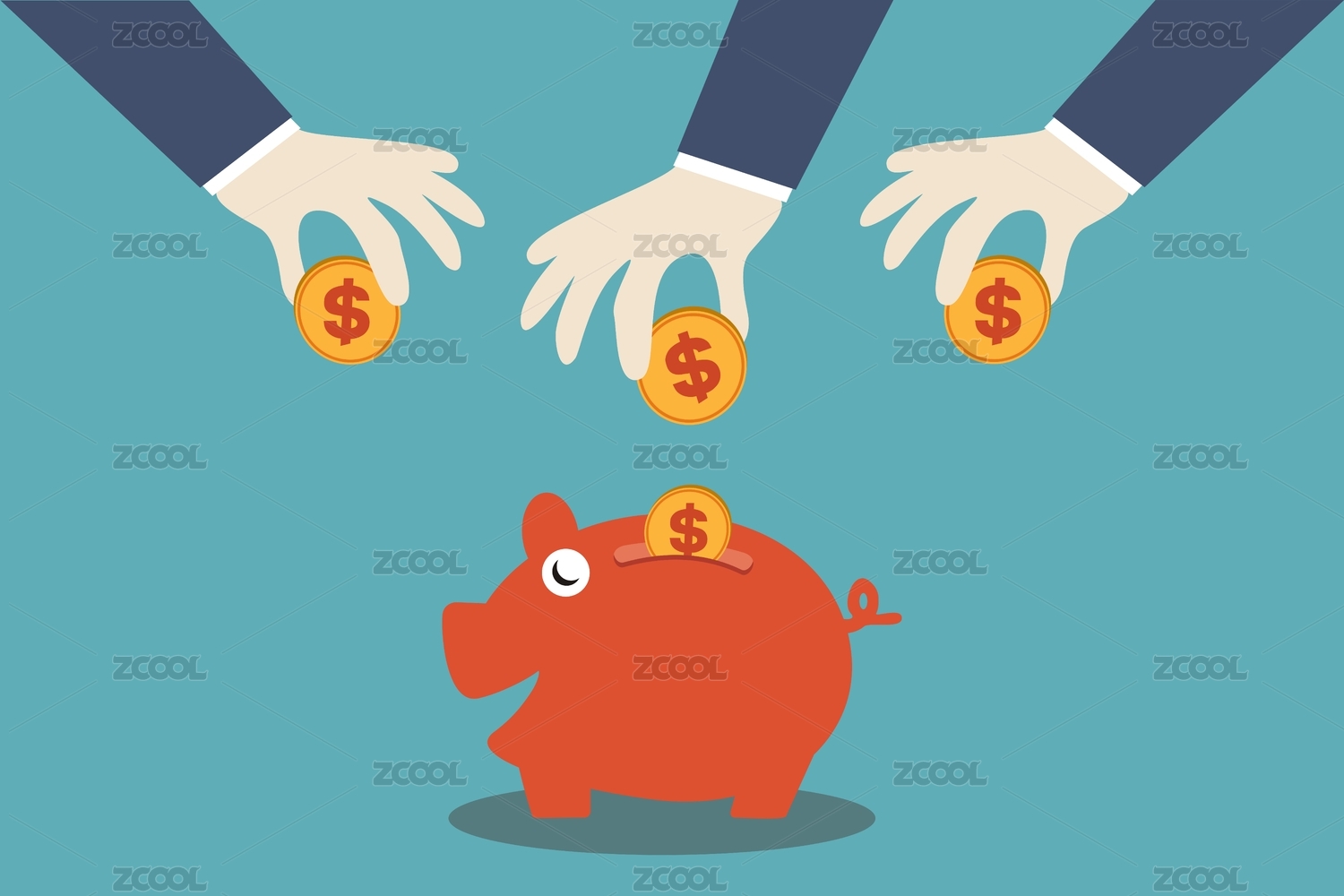 许多手把硬币放进一个小猪储钱罐。储蓄和投资的概念。矢量设计