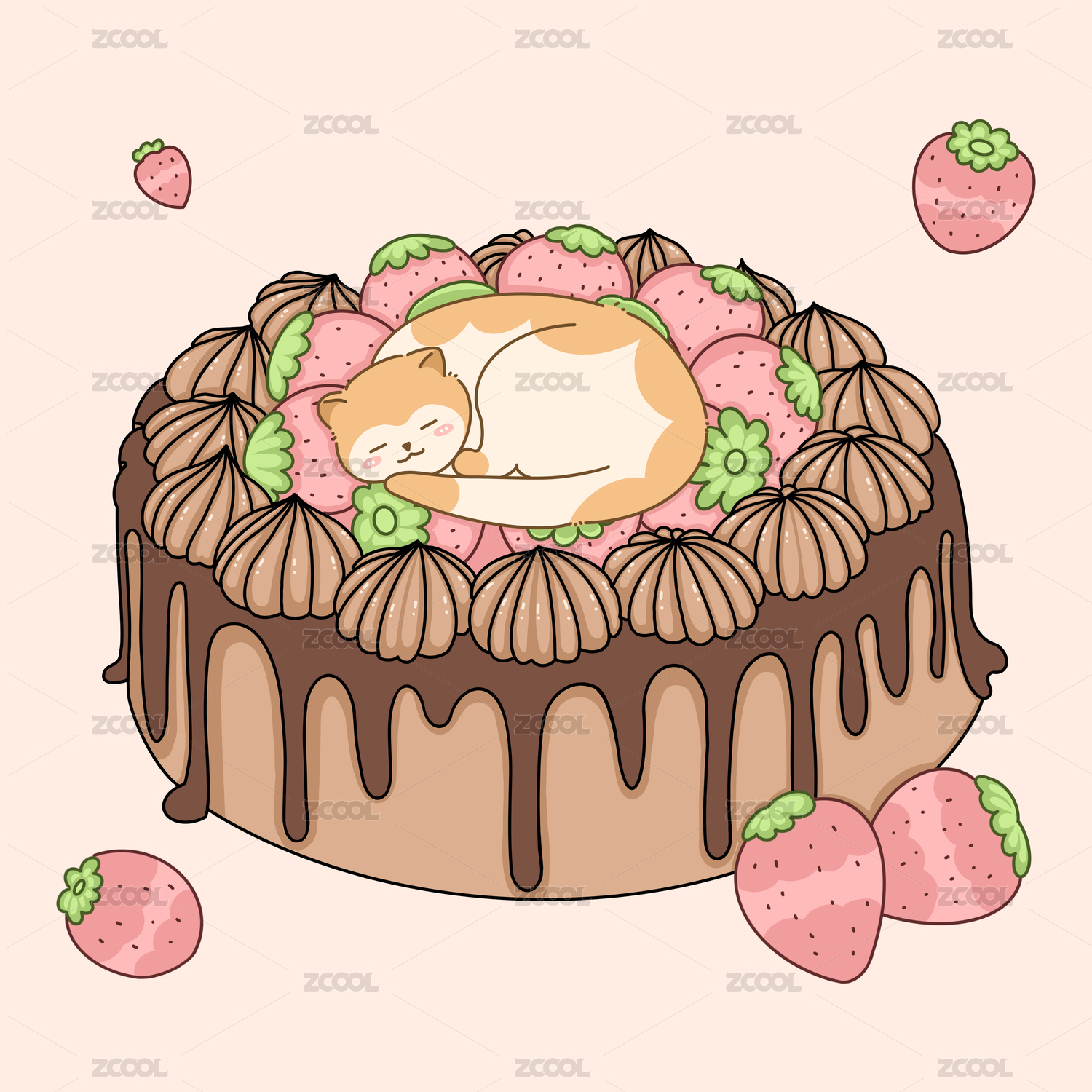 卡通草莓猫咪桌布图案
