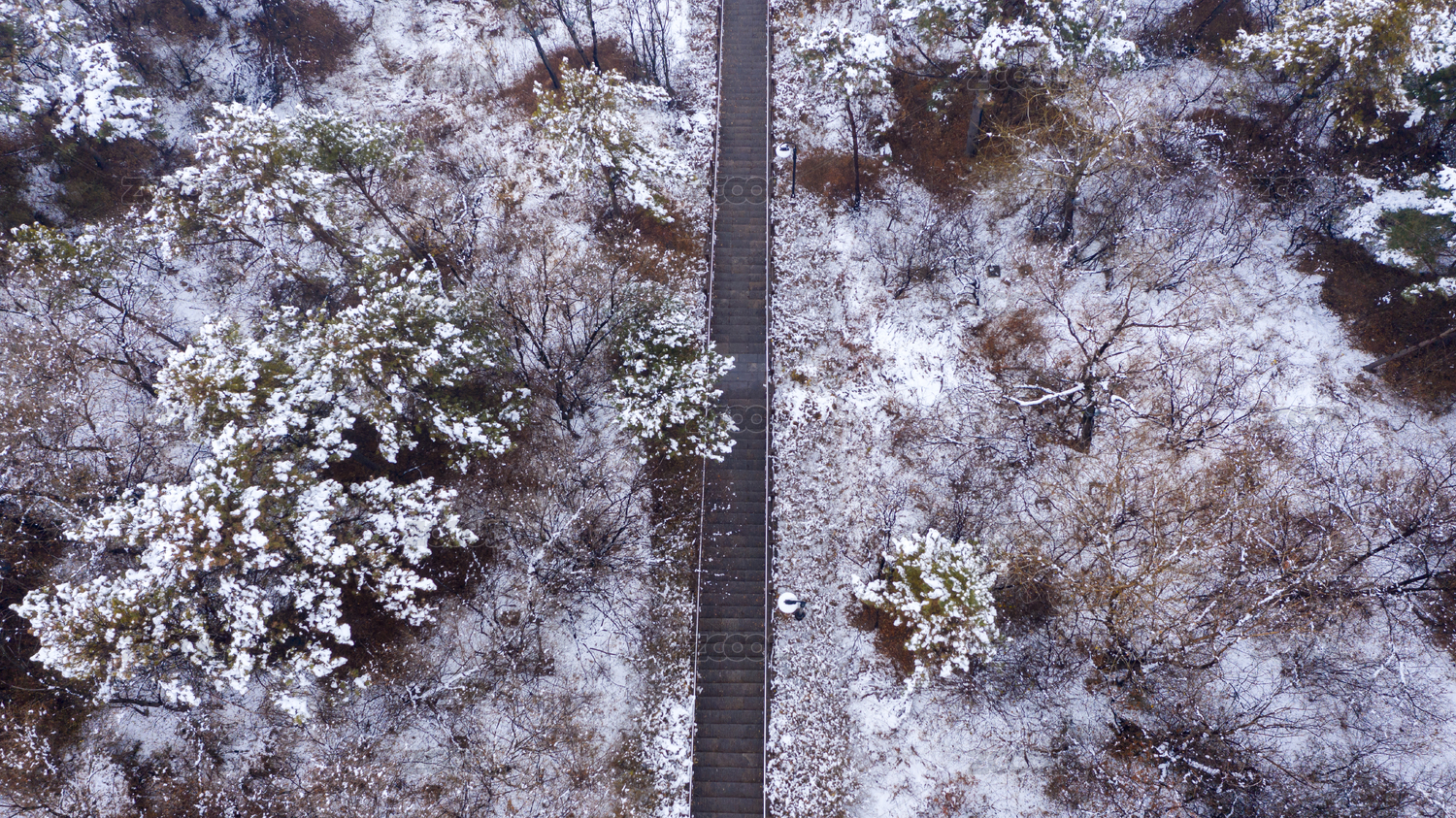 城市公园里冬天雪后山上树林中景观路雪景