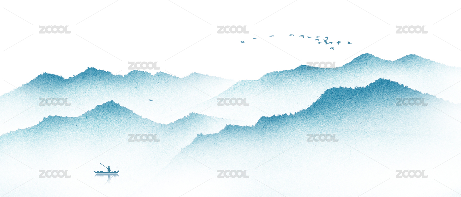 手绘蓝色纹理新中式山水画