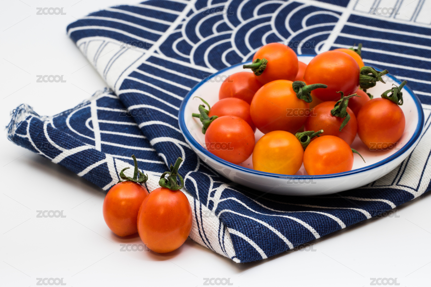蓝色纹理桌布上的橙色小番茄