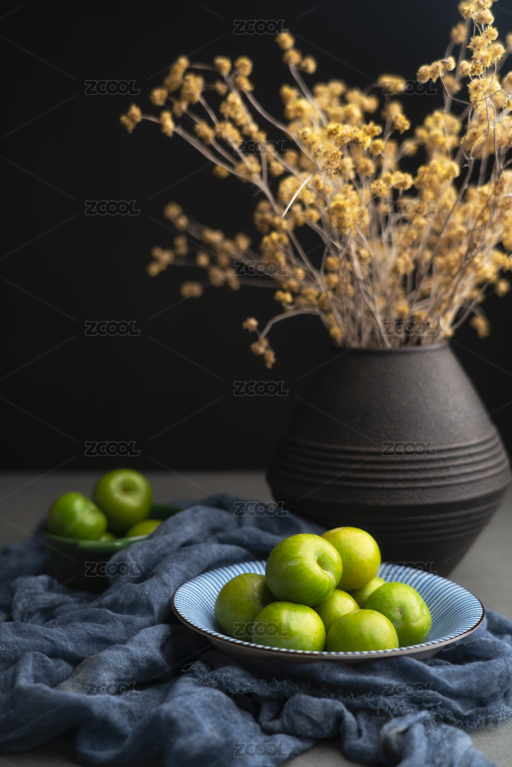 放在蓝色纹理盘子中的李子和干花暗调背景静