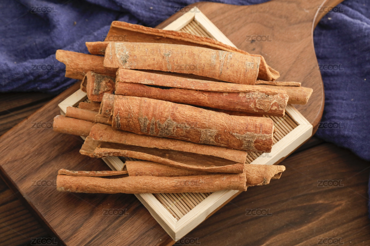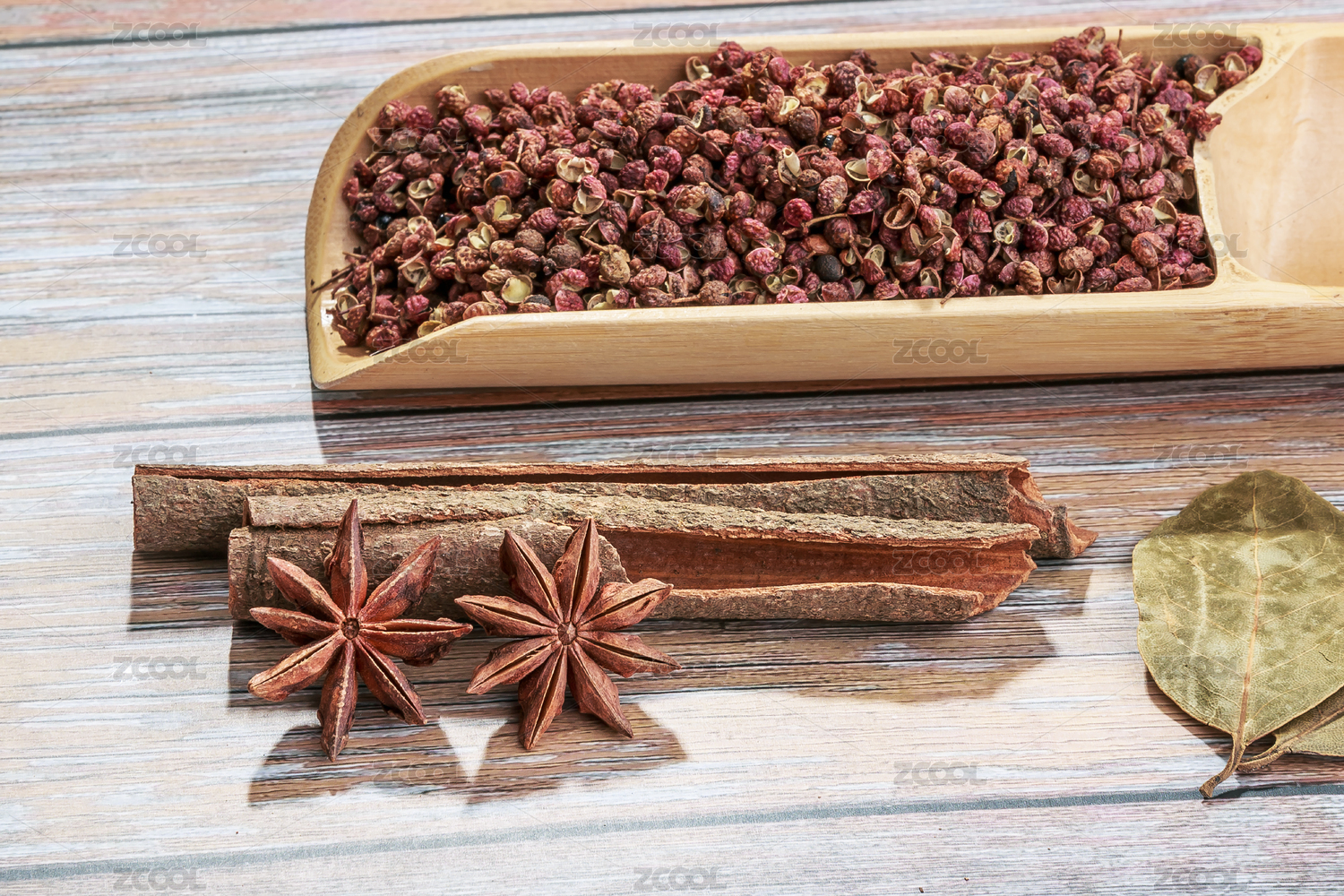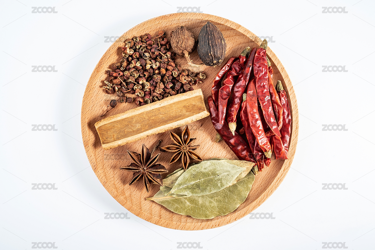 一盘中餐常用香辣烹饪调料香料,桂皮和香叶特写