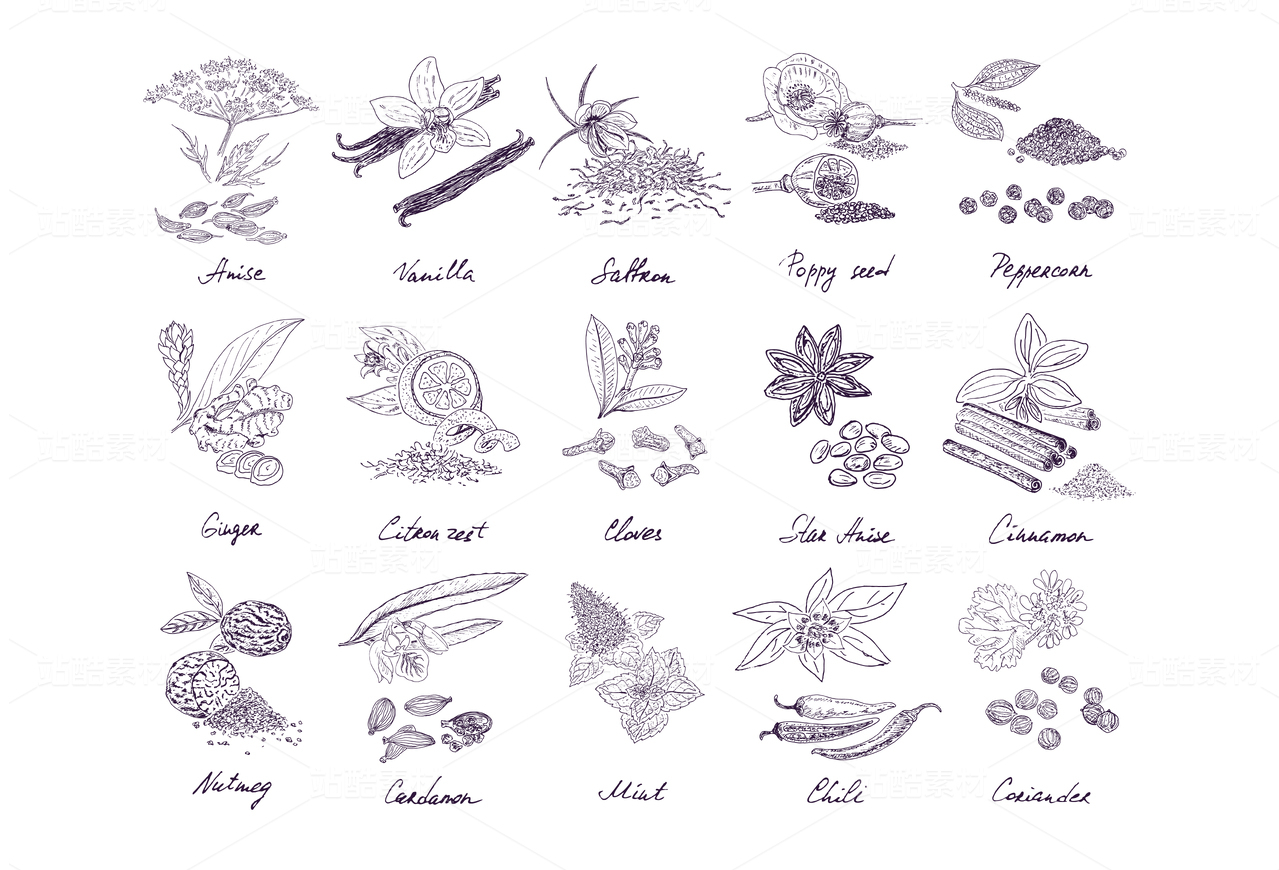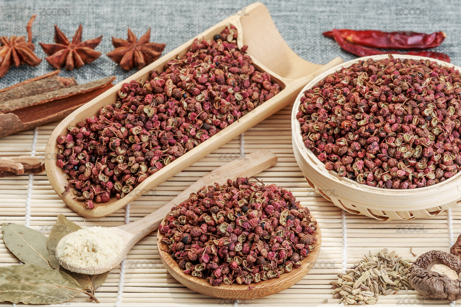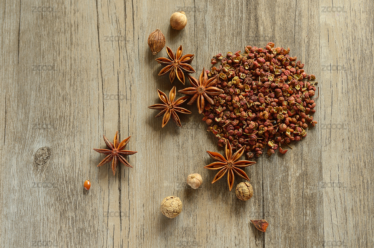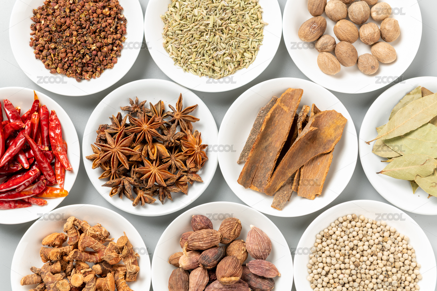 一盘中餐常用香辣烹饪调料香料,桂皮和香叶特写