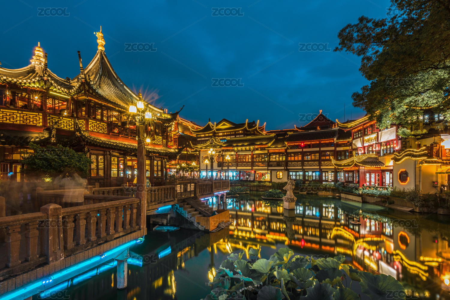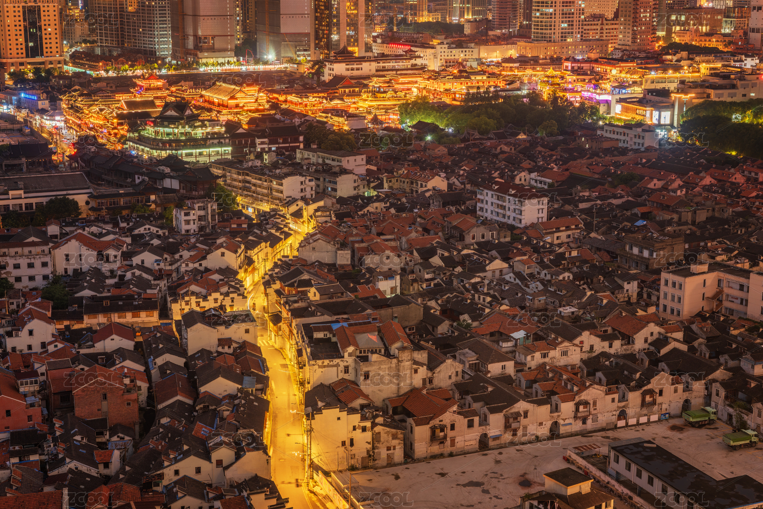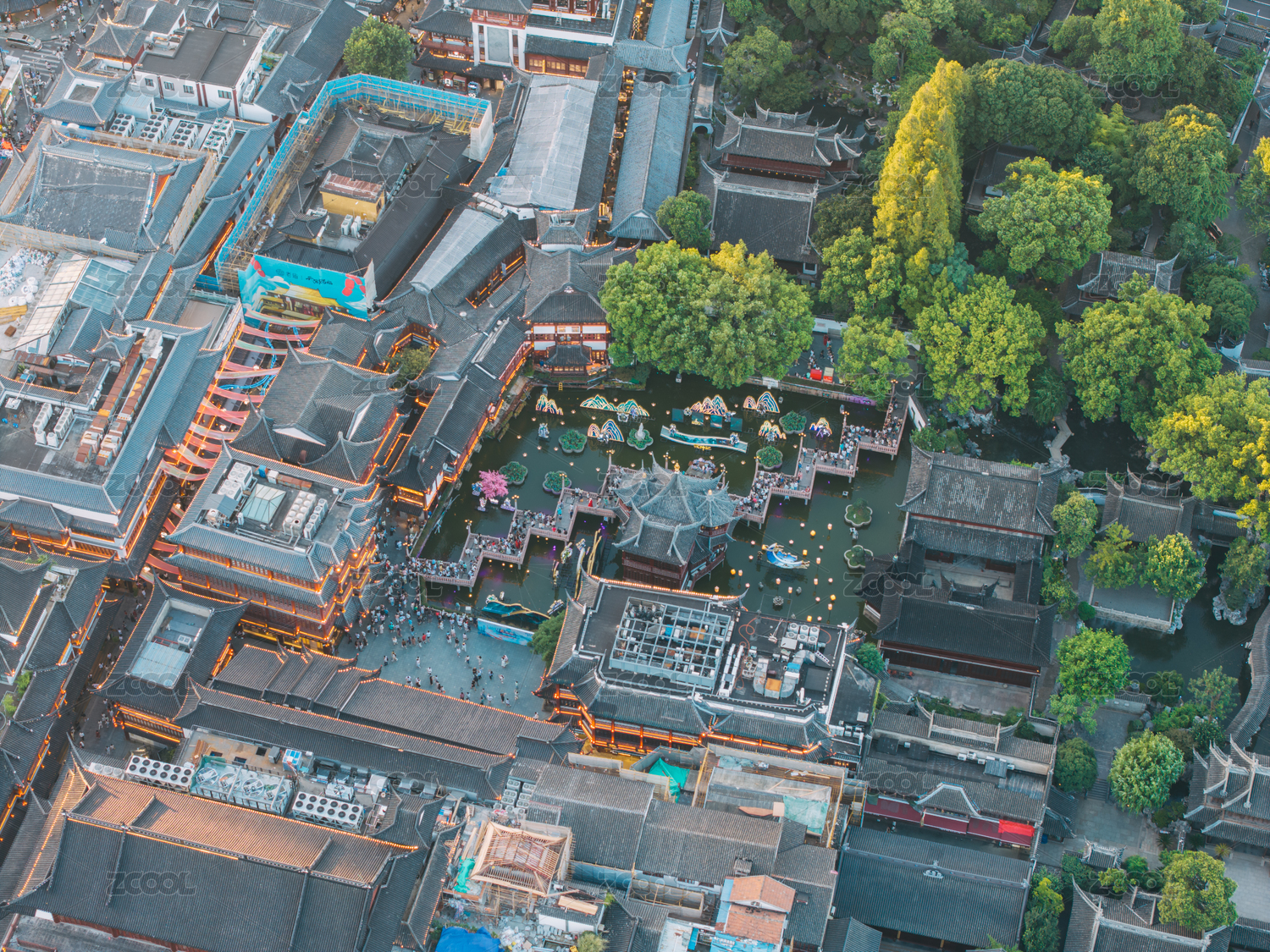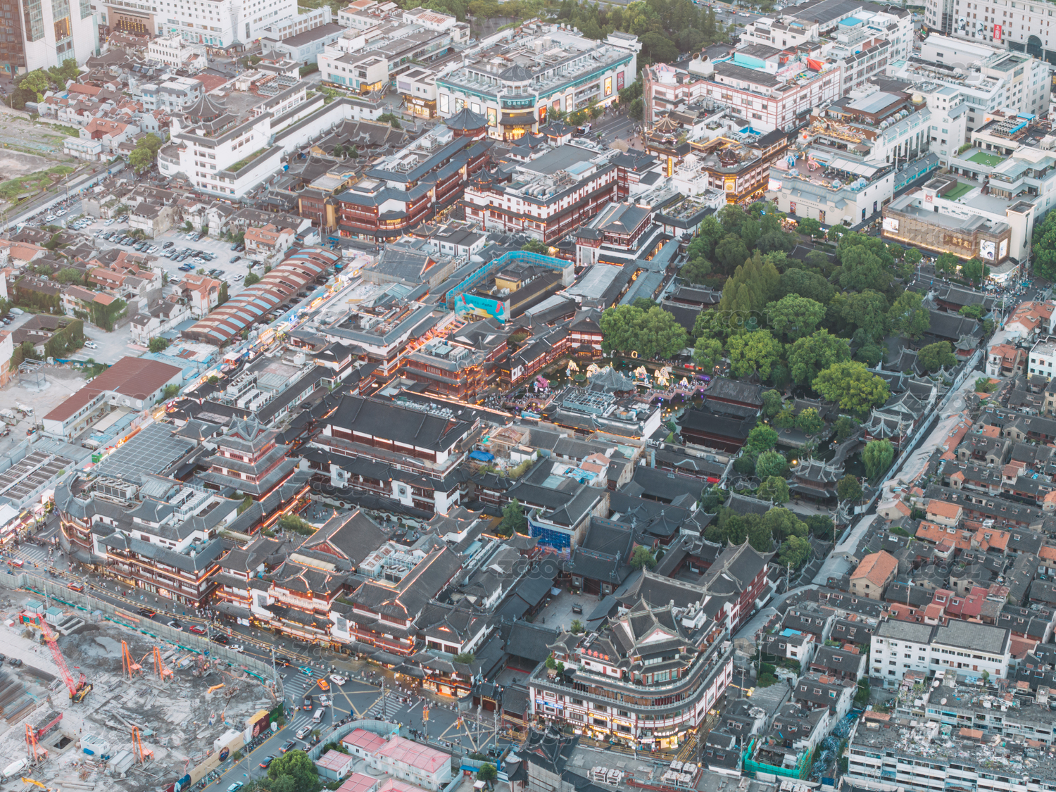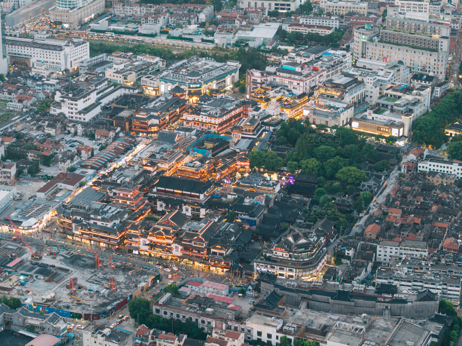 俯瞰上海豫园城隍庙夜景亮灯蓝调时刻