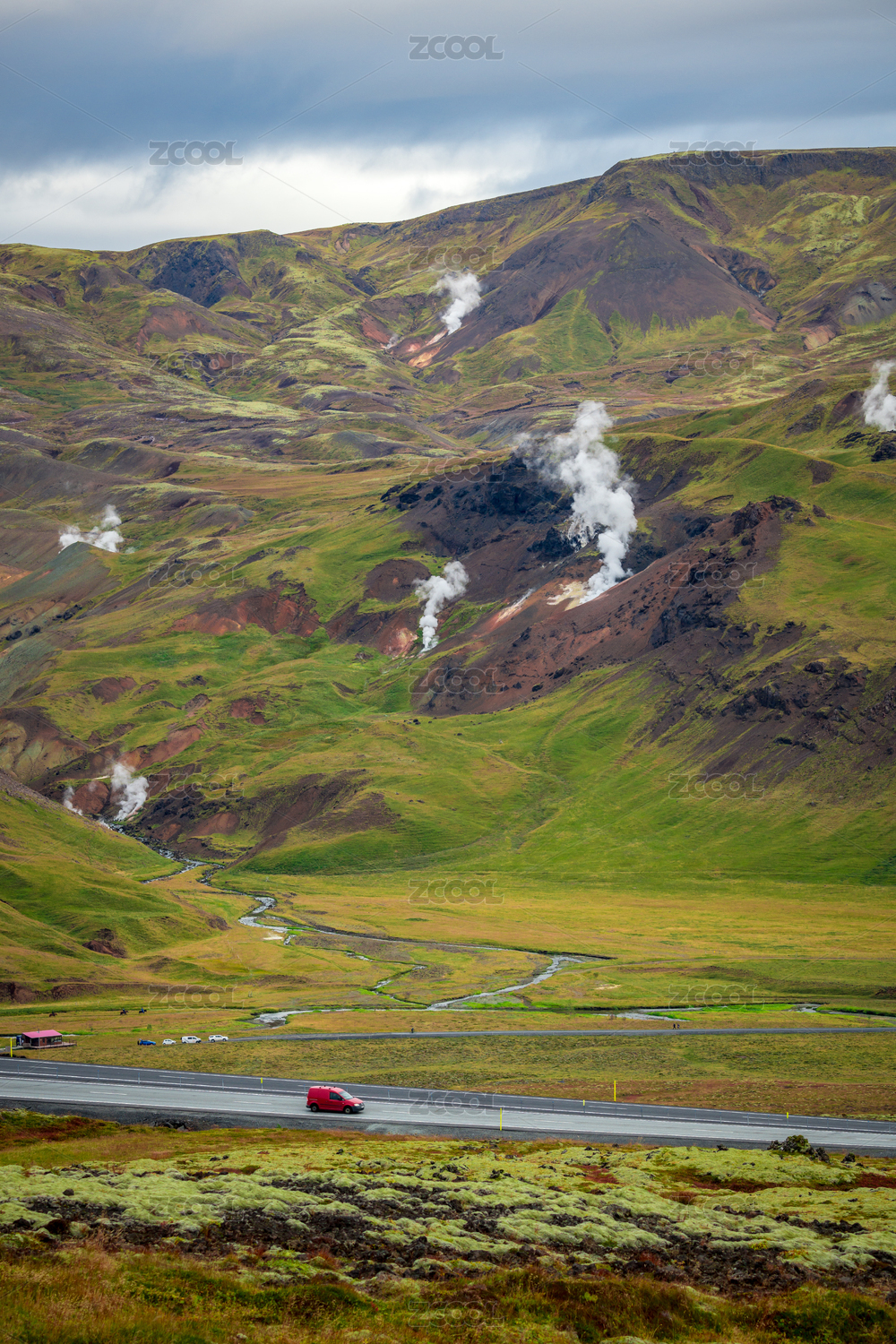 行驶在冰岛南部如油画般的火山地热地质地貌壮丽景观中的汽车
