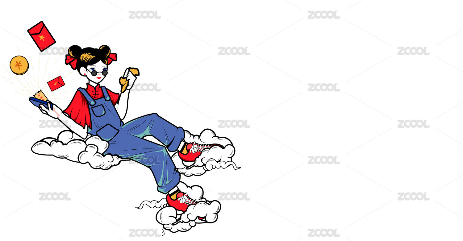 坐在云端上抢红包优惠券的女孩