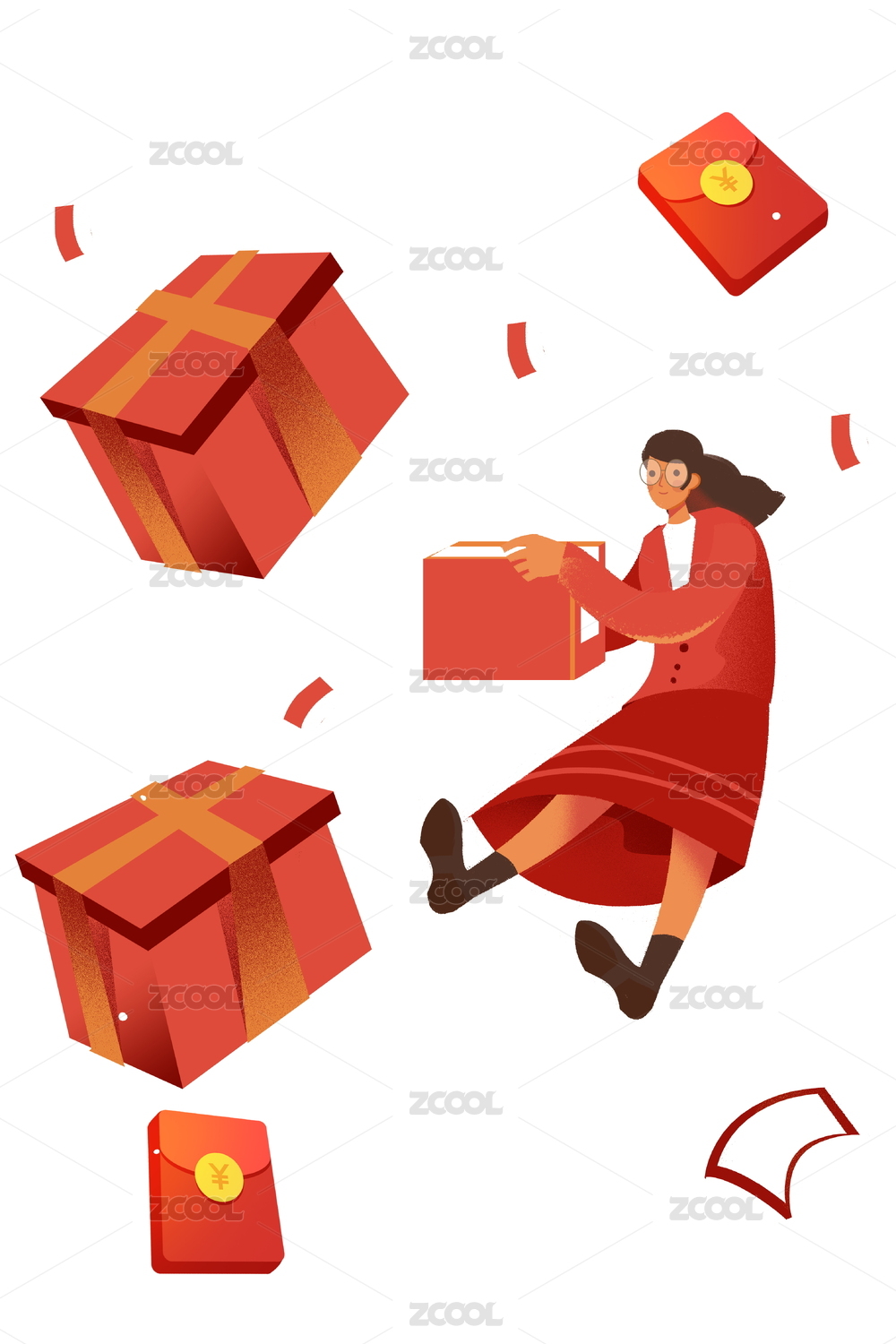 卡通手绘女生手机购物快递礼盒年货红色喜庆插画