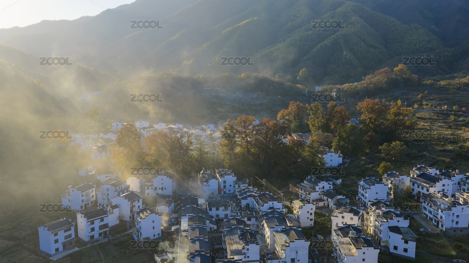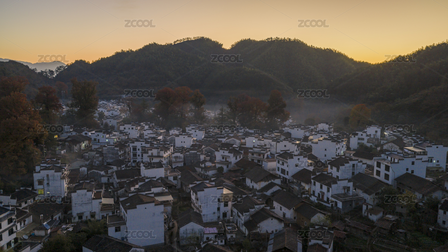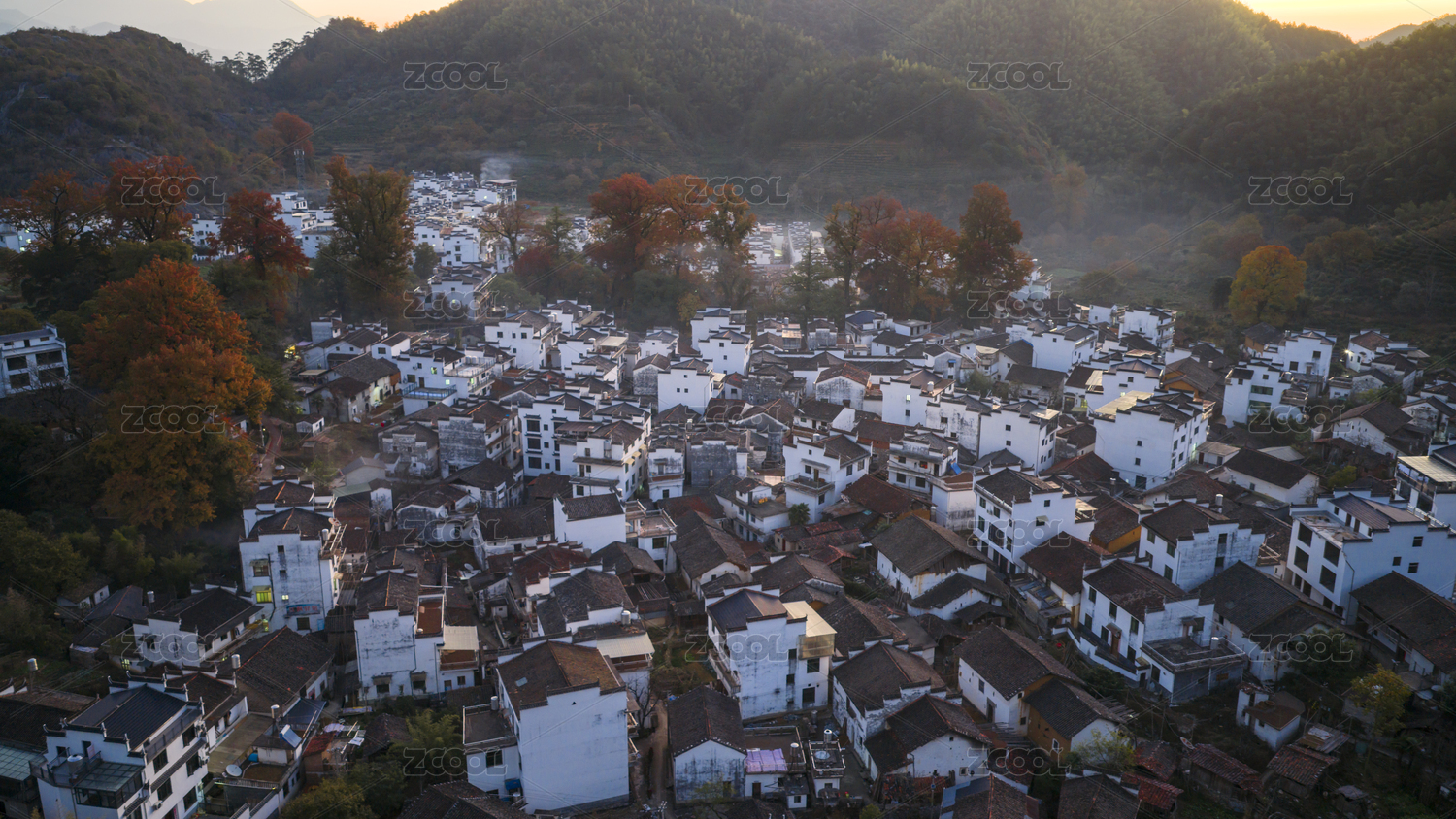 航拍江西婺源石城徽派建筑秋色枫叶村庄日出