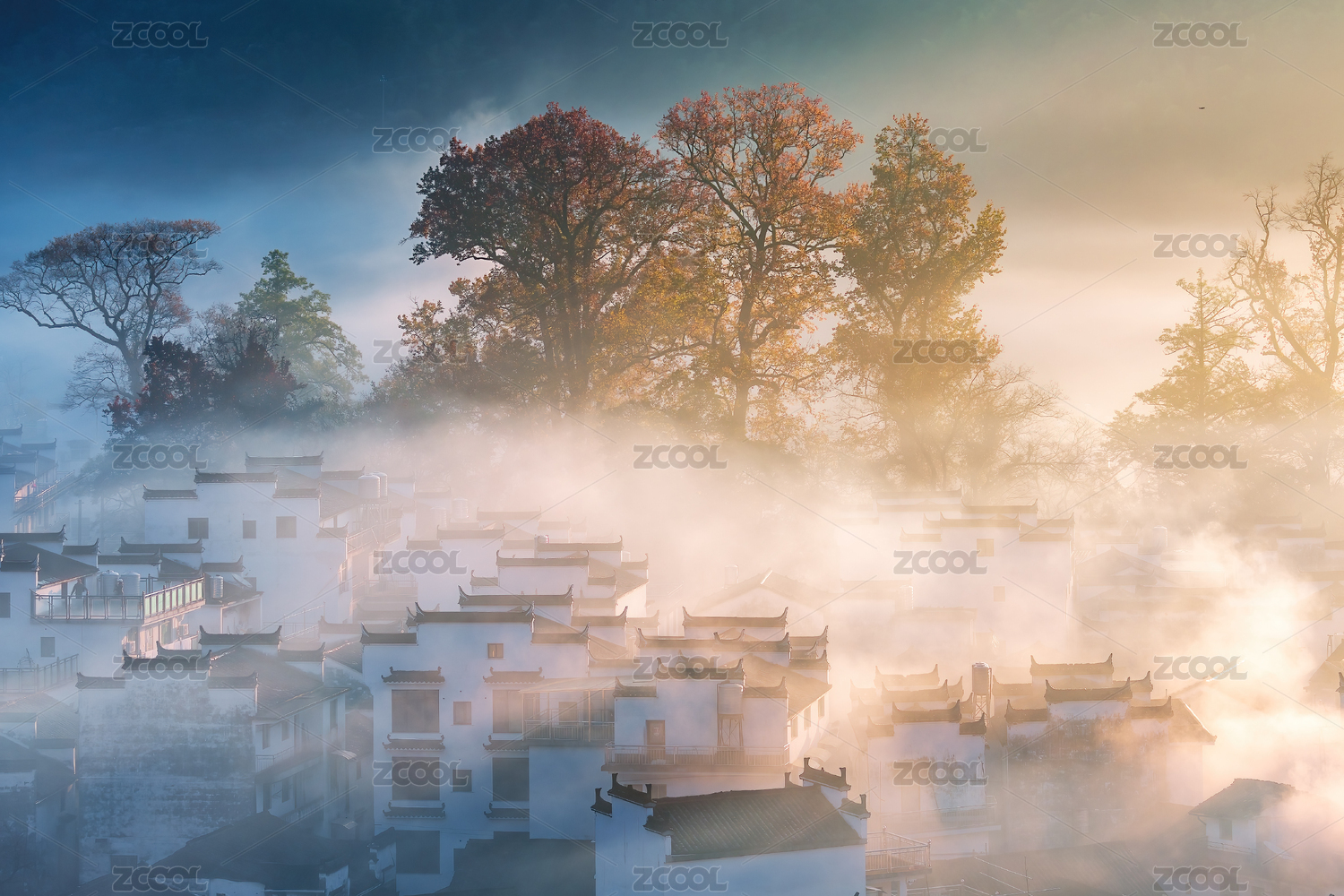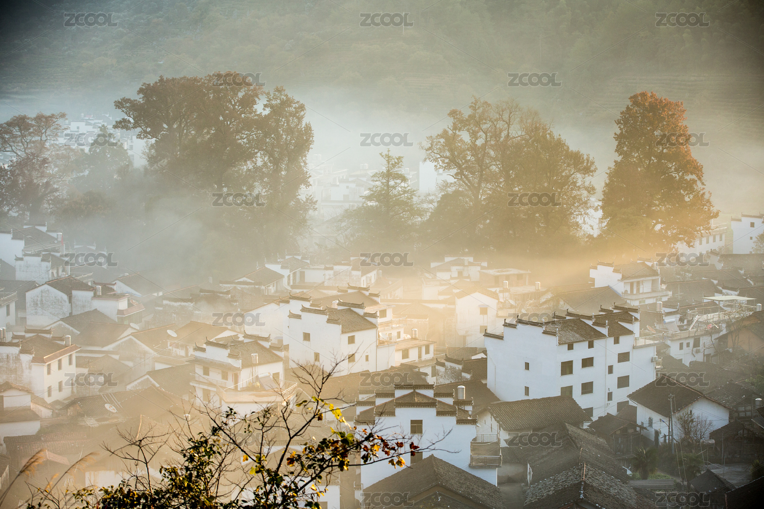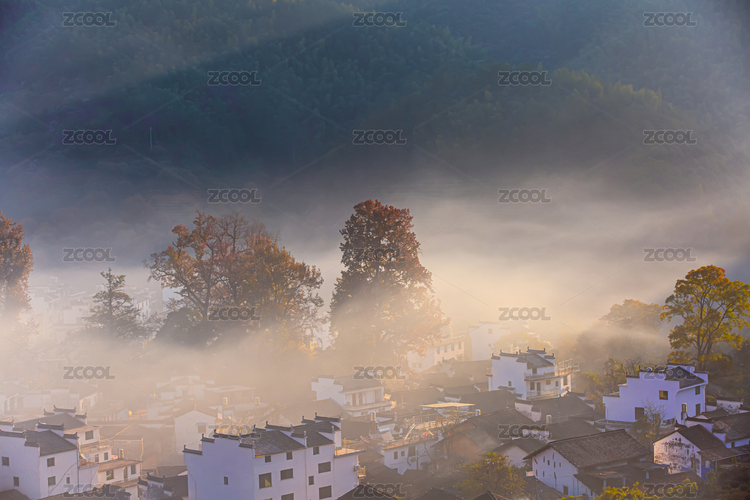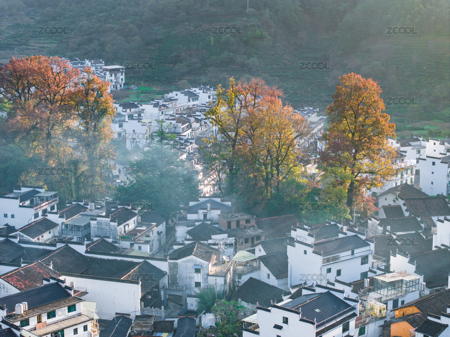 航拍江西婺源石城徽派建筑秋色枫叶村庄日出